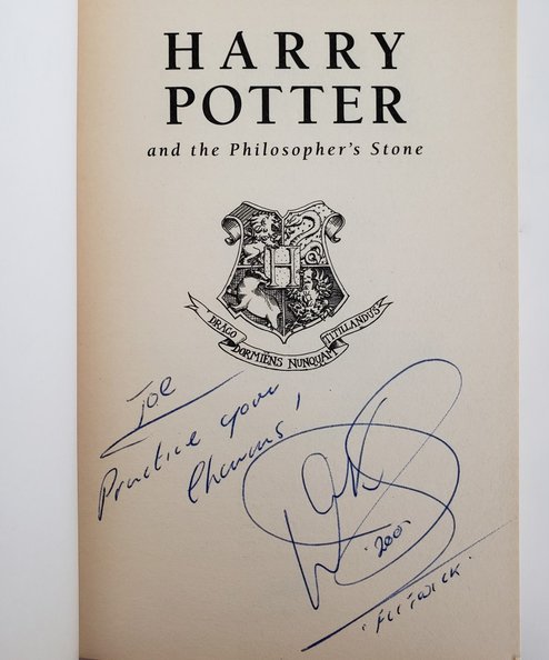 First thus with complete number string from 10-1. Softcover octavo, pp. 223, [1]. Hogwarts crest to half-title and title page. Publishers’ pictorial card wraps with colour cover illustration by Thomas Taylor. Inscribed to half title: “Joe Practice your charms!” with actor Warwick Davis’ signature and date 2001 above character name “Flitwick”. A near fine copy with a hint of shelf wear to edges.