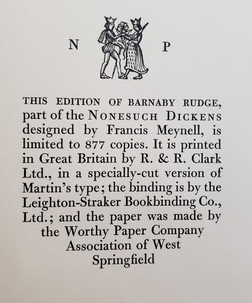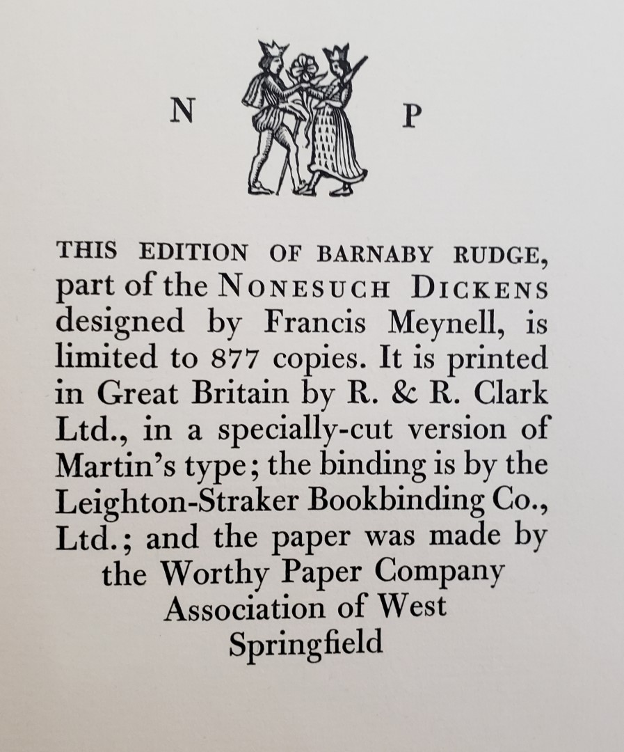 LIMITED EDITION of 877 copies only. Large octavo, pp., ix, [3], 685, [3]. Illustrated throughout with engravings and decorative initial letters by Phiz and Cattermole, plus facsimiles of the frontispieces to “Master Humphrey’s Clock” and the 1849 Cheap Edition, and the engraved title-pages for Volumes I and II of the 1858 Library Edition. Original blue buckram bound by Leighton-Straker Bookbinding Co, with gilt titles to black label to spine; top edge gilt, others uncut. Spine lightly sunned and a little foxed; boards bumped at corners and upper board damp-stained to lower third. Endpapers lightly foxed otherwise contents clean, with no annotation or inscriptions. A very good copy overall.