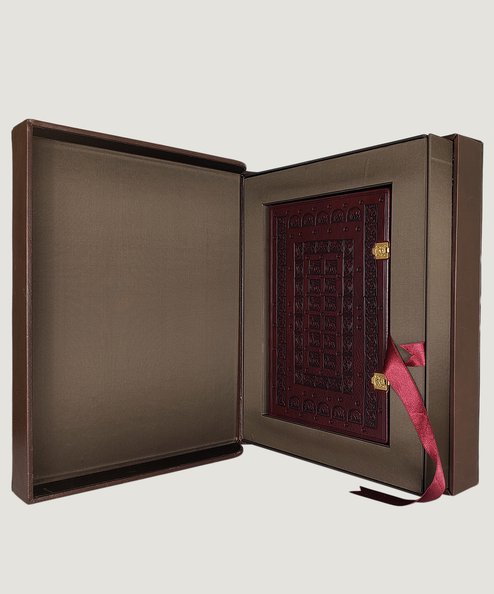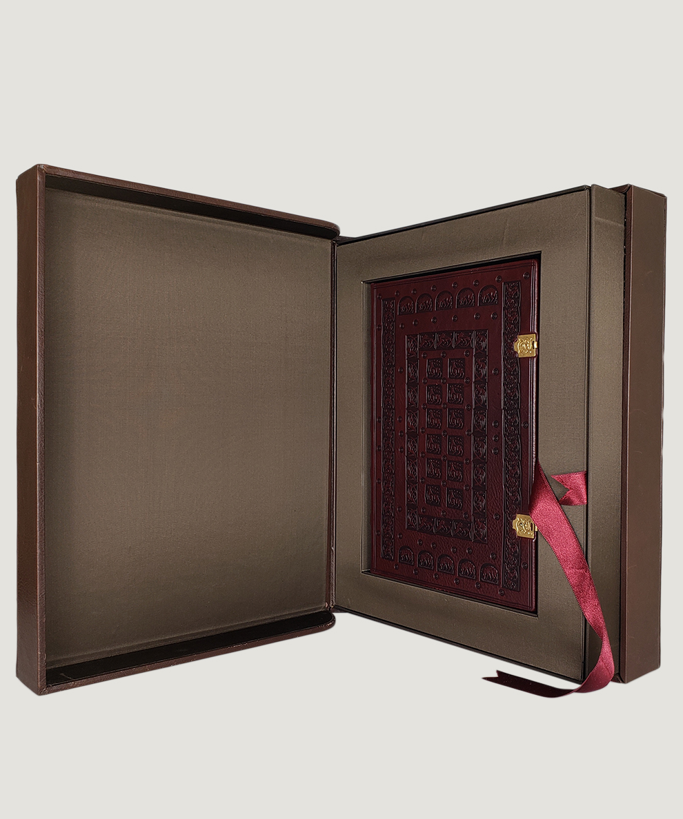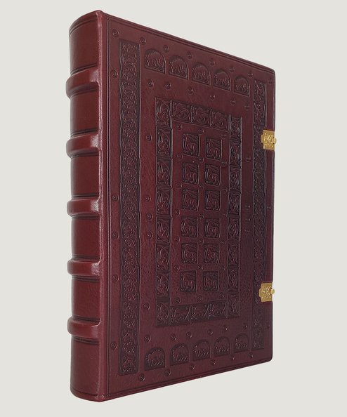 No 996 in a Limited Edition of 1125 copies numbered with Arabic numerals. Quarto, pp., 418, [2]. Full deep maroon morocco with 5 raised bands and boards heavily decorated with animal motifs in blind; engraved gilt clasps; all edges gilt. Faithful reproduction with 40 full page miniatures and over 200 large historiated initials. ”Commentary” pub., 2008; quarto, pp., 243. [1] with numerous monochrome illustrations within text; bound in maroon cloth with gilt titles to spine and upper board. Volumes housed in lined full leather book box with gilt titles and maroon silk ribbon openers, with lower compartment for “Commentary”. Volumes in fine condition with book box with a few surface scuffs only.
