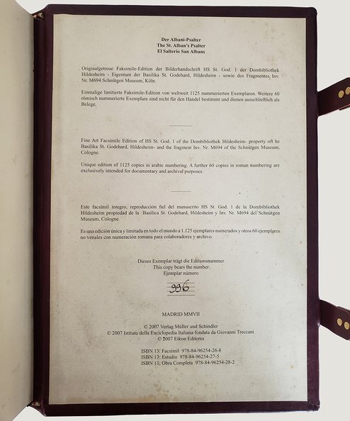 Facsimile edition of HS St God. 1 of the Dombibliothek Hildesheim and the fragment of Inv Nr M 694 of the Schnutgen Mueum, Cologne. The early twelfth-century English psalter is the most precious manuscript on the Hildesheim diocese, which houses richly decorated liturgical volumes from the days of Bishop St Bernard in its Cathedral library. The probable patron was Geoffrey, Abbot of St Albans and the likely recipient was his associate Christina of Markyate, ascetic and Prioress, whose life forms part of the subject matter. A key text in the twelfth century renaissance in England, the work was created at St Albans and is of particular interest to scholars of the French language as it includes the earliest surviving example of a text containing a substantial piece of literature written in French (the Chanson de St Alexis). Widely considered to be one of the most important examples of English romanesque book production, the manuscript is a triumph of lavish illumination. Heavyweight so a contribution towards increased postage costs will be requested for overseas delivery.