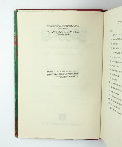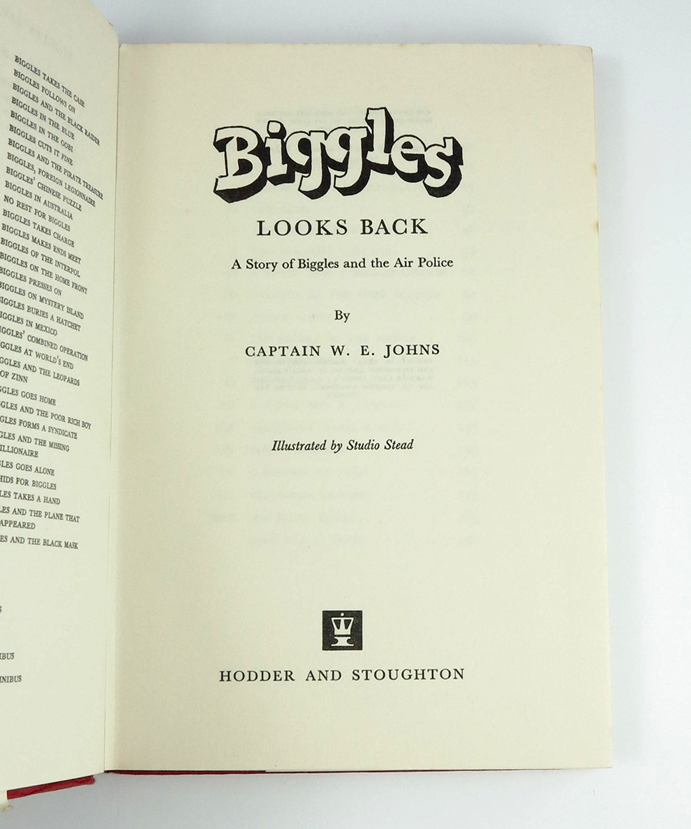 First edition, first impression. Octavo, pp. 191, [1]. Illustrated by Studio Stead. Publishers’ red cloth with black titles to spine in unclipped pictorial dust-jacket. Spine tips a little creased but cloth bright; text-block edge lightly foxed otherwise contents clean with no annotation or inscriptions. Jacket lightly soiled with two bold blue marker pen strokes through list of Biggles titles to rear, and a few of the titles crossed through; spine rubbed with minor loss, and 1 cm closed tear at head. A very good copy in like dust-jacket.
