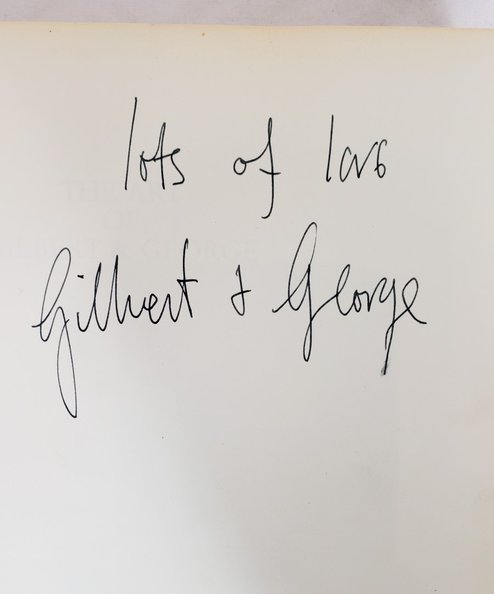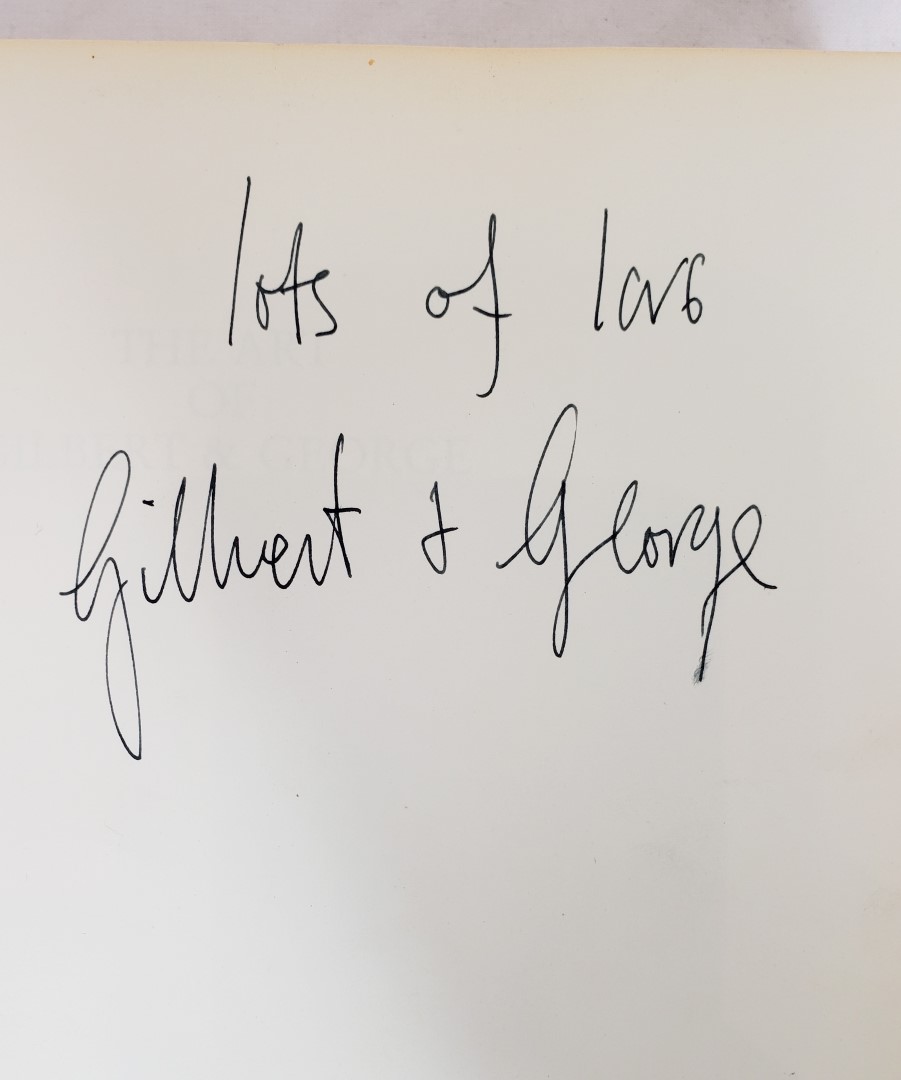 INSCRIBED FIRST EDITION. Quarto, pp. 524. 406 illustrations, of which 291 in colour. Publisher’s royal blue cloth with gilt titles to spine and upper board, in unclipped pictorial dust-jacket. Boldly signed by the artists in black ink to front free endpaper: “lots of love Gilbert + George”. Dust-jacket spine sunned with light soiling to spine tail, and slight surface scuffs to upper and lower panels. A near fine book in a very good dust-jacket.