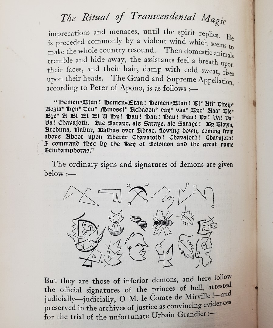 A slightly shaken copy; cloth lightly rubbed to corners with minor wear to spine-tips. Striking mid-century bookplate to front paste-down and small neat ink owner’s name “Sealbert” to front free endpaper, a few light spots of foxing to prelims else clean. Rare copy of Eliphas Levi’s (1810-1875) most influential work and his final treatise on ritual magic, with each section being split into twenty-two chapters to mirror the Major Arcana of the tarot. Indeed it is Levi who is responsible for our modern understanding of the tarot as a tool of divination rooted in esoteric symbolism. Translated from the French by the English mystic, ceremonial magician, and co-creator of the Rider-Waite tarot deck, A. E. Waite. The influence of this work, via Waite's translation, on late nineteenth/early twentieth century British occultism is difficult to overemphasise. Transcendental Magic directly informed the formation and ceremonies of the Hermetic Order of the Golden Dawn as well as impressing upon a young Aleister Crowley who was so enamoured with Levi that he proclaimed himself Levi’s reincarnation. This is the second, and best, edition, substantially revised with over 100 more pages than the first. The book is complete with 23 illustrations including a plate depicting Levi's infamous interpretation of Baphomet, which went on to become an key figure in the cosmology of Crowley's Temple of Thelema.