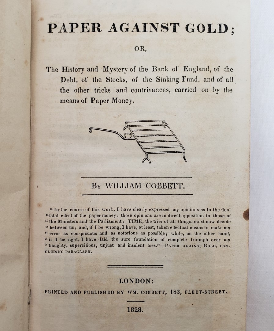 Originally published as letters in Cobbett’s Political Register between 1810-17, many written from Newgate Prison. The debt caused by spending on the Napoleonic wars resulted in the National Debt being financed by paper money instead of gold, and led to galloping inflation creating hardship for the poorest of the population and the labouring classes, which is pointed out by Cobbett as a champion of the poor. Cobbett was an ardent supporter of returning to the Gold Standard.