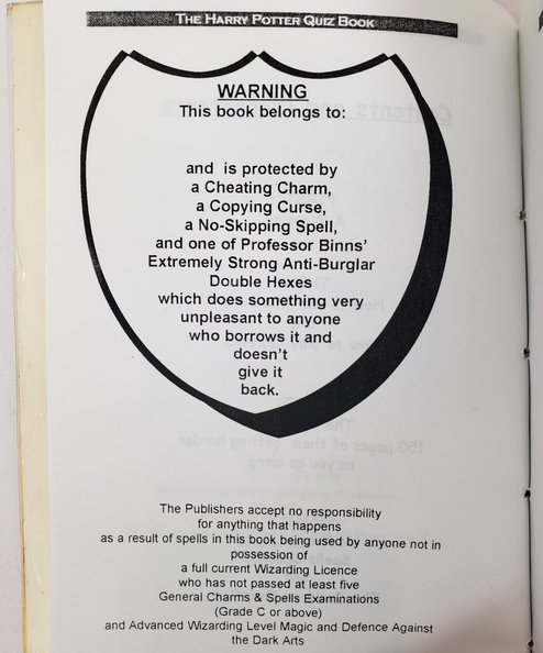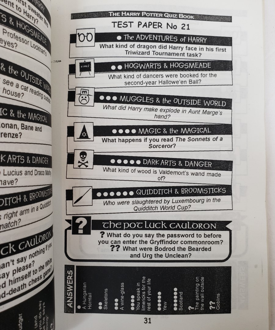 Packed full of quiz questions about the Harry Potter characters and books, and made-up during the height of Pottermania, this collection of conundrums is presented as a series of Test Papers, and includes all the answers at the foot of the page. Compiler Jon Smith, the well respected journalist, made up these dummy books with the intention of getting them published by Bloomsbury who rejected the idea. The 6 copies were ultimately distributed to family and friends. One man’s unique and highly imaginative contribution to the biggest publishing phenomenon of the 20th century.