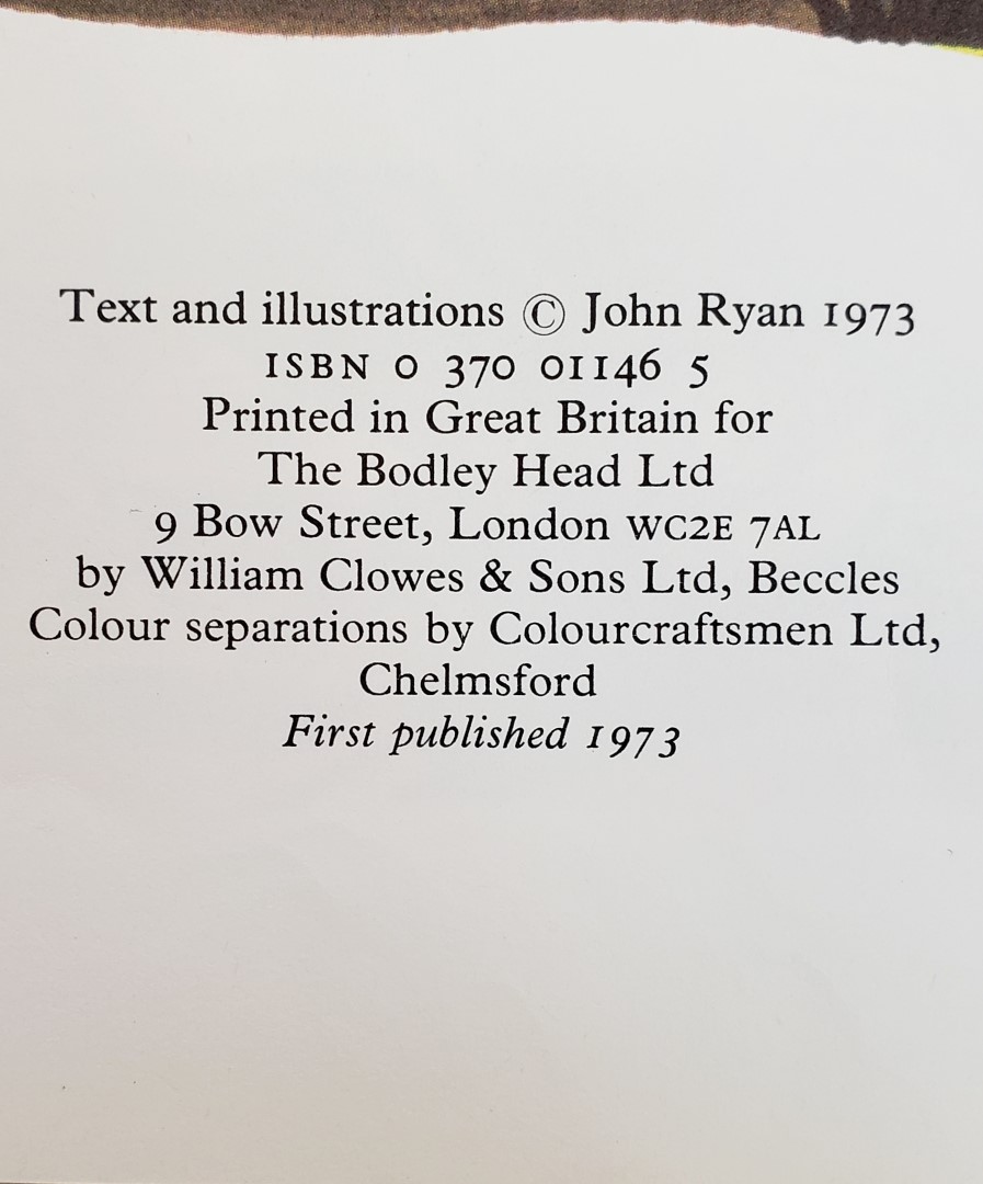 First edition. Quarto, pp. 29, illustrated throughout with coloured ink drawings by John Ryan. Publisher’s apricot pictorial boards in matching dust-jacket. Slight rubbing to edges and spine tips, with a little creasing and rubbing to edges and spine of dust-jacket. 6cm faded black mark on rear of dust-jacket.