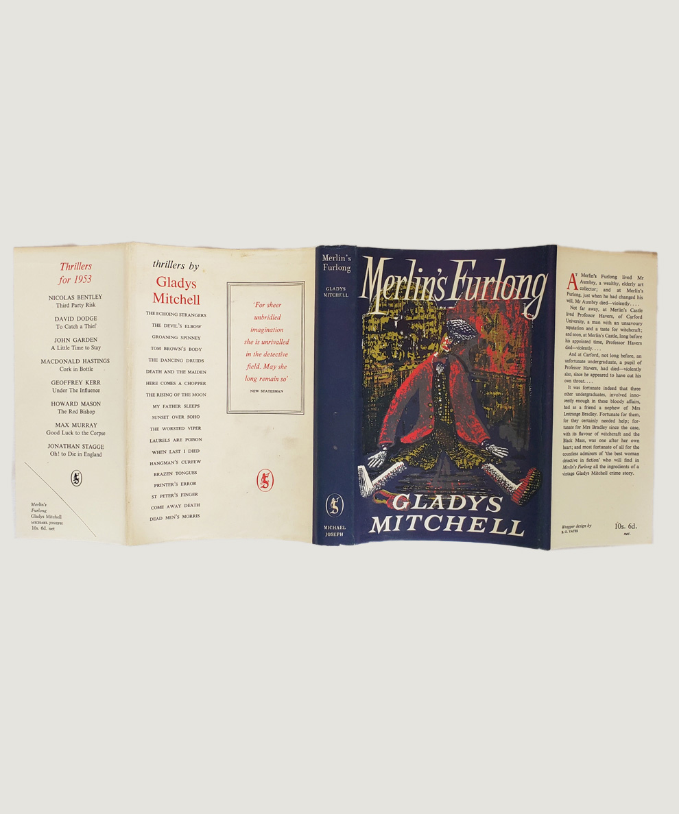 Classic crime novel in the Mrs Bradley series, centring on a number of mysterious and violent deaths at Merlin’s Castle, with an unnerving link to witchcraft. Stylised dust-jacket artwork by B. G. Yates.
