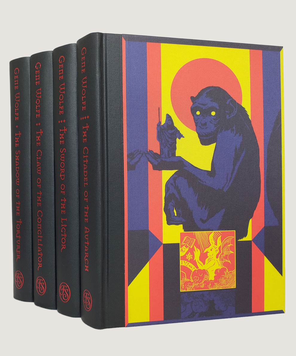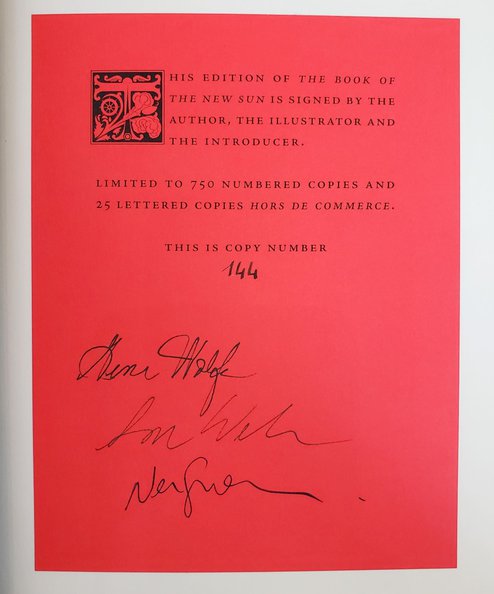 First thus: triple signed limited edition: number 144 of 750 copies only. Large octavo, pp., xv, [1], 287, [1]; vii, [1], 280; vii, [1], 282; vii, [1], 281, [1]. With 20 plates by Sam Weber including frontispiece and double-page spread to each volume. Publishers’ black cloth bindings, with pictorial cloth in purple and yellow to upper boards blocked in colour, and metallic red titles to spine. All edges stained black. Housed in black cloth-covered slipcase with titles in gilt and sword and rose motifs in gilt to side faces. Volumes all clean and bright, with printed Limitation Plate to first blank Vol I signed by Gene Wolf, Neil Gaiman and Sam Weber. Slipcase very slightly surface scuffed. A fine set in near fine slipcase.