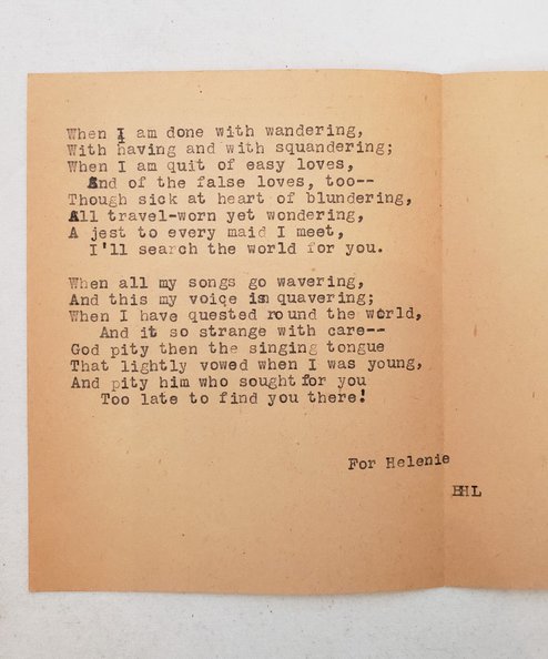 Inscribed first edition. Octavo, pp. [12], 275, [1]. 12 plates by Mahlon Blaine, plus vignette to title page, numerous head- and tail-pieces, decorative initial letters, and endpapers. Publishers’ black cloth with red titles to spine and gilt motifs to spine and upper board, in unclipped pictorial dust-jacket. A very good copy in good dust-jacket, with an affectionate gift inscription to first blank from the author to ‘Helenie’, dated in year of publication. With a typed poem from the author, also ‘For Helenie’ loosely inserted. Boards slightly damp-stained top edge. Small stain top edge of textblock affecting margin only. Some tears and loss to dust-jacket, with adhesive tape repairs to reverse.