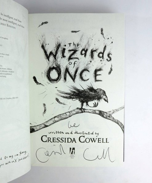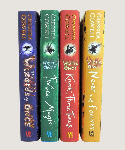 An attractive four volume set of Cowell’s Wizards of Once series, all first editions signed by the author. Octavo. pp. 389 [11]; 386 [6]; 383 [7]; 384 [10]. Wizards of Once, publisher’s orange cloth with title and decoration blocked in metallic purple to spine and boards in an unclipped, pictorial dust-jacket. Twice Magic in publisher’s sea green cloth with title and decoration blocked in metallic blue to spine in an unclipped, pictorial dust-jacket. Knock Three Times in publisher’s yellow cloth with gilt title and decorations to spine and boards in an unclipped, pictorial dust-jacket. Never and Forever is in publisher’s black cloth with gilt title and decoration to spine and boards in an unclipped, pictorial dust-jacket. A near fine set. The Wizards of Once, boldly signed by the author to the title page. Twice Magic bears Cowell’s inscription to the verso of the front free end-paper ‘Cressida Cowell 31/08/18 65 of 100 signed and dated’, with a hand drawn illustration by Cowell above. Knock Three Times has Cowell’s inscription to title page ‘79 of 100 to be signed 19.09.2019 Cressida Cowell’. Never and Forever, boldly signed by Cowell to the title-page.