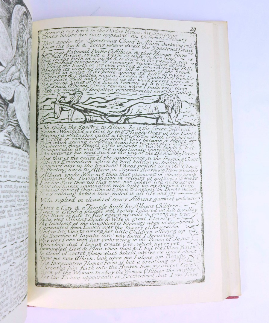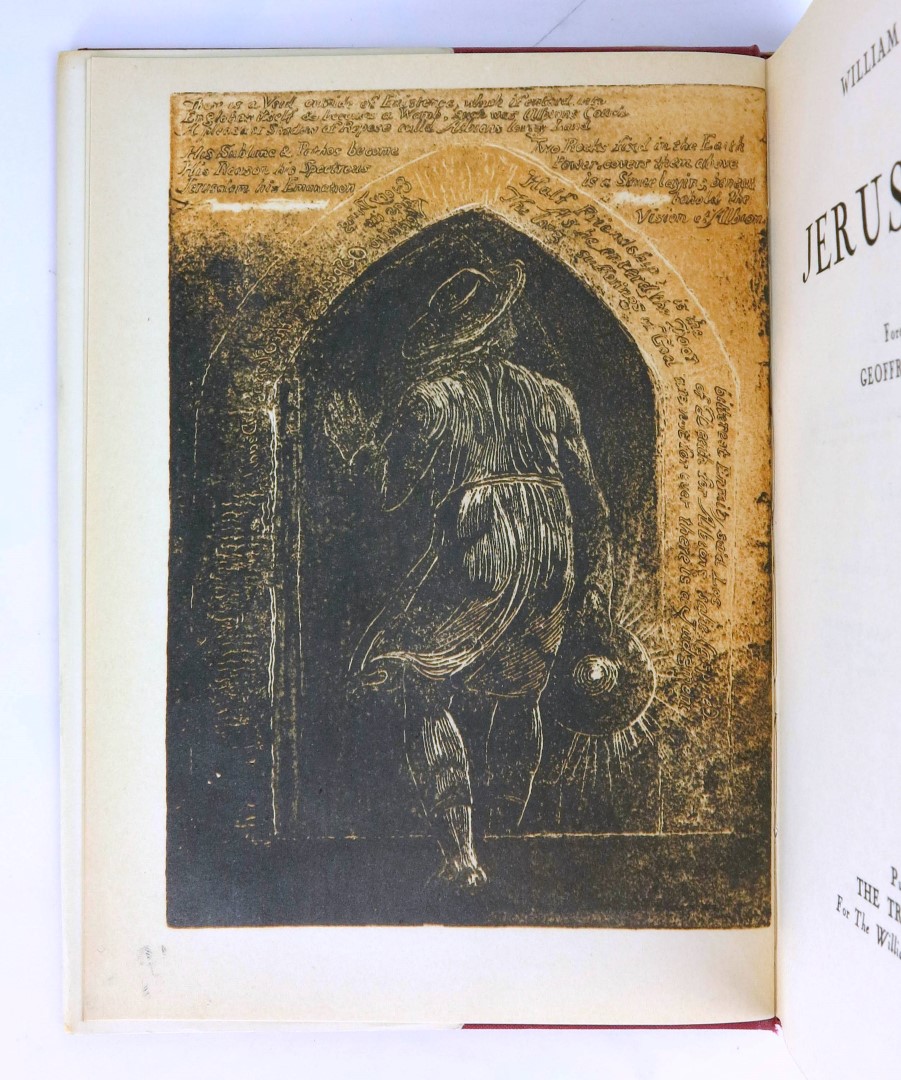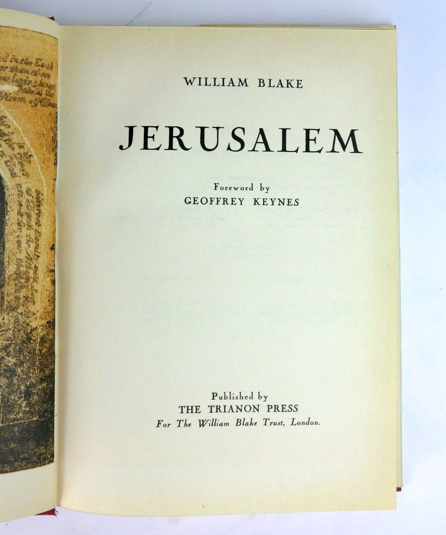 Published by the Trianon Press for the William Blake Trust, this volume exquisitely reproduces the Linnell-Rinder copy of Jerusalem in deep etched engraving in black ink by Aulard of Paris. Accompanied by a typographical reprint of the text. With foreword by George Keynes. Keynes founded the William Blake Trust and was instrumental in establishing Blake as a central figure in the history of English art and literature.