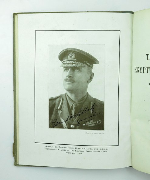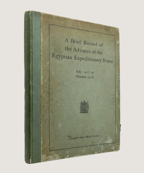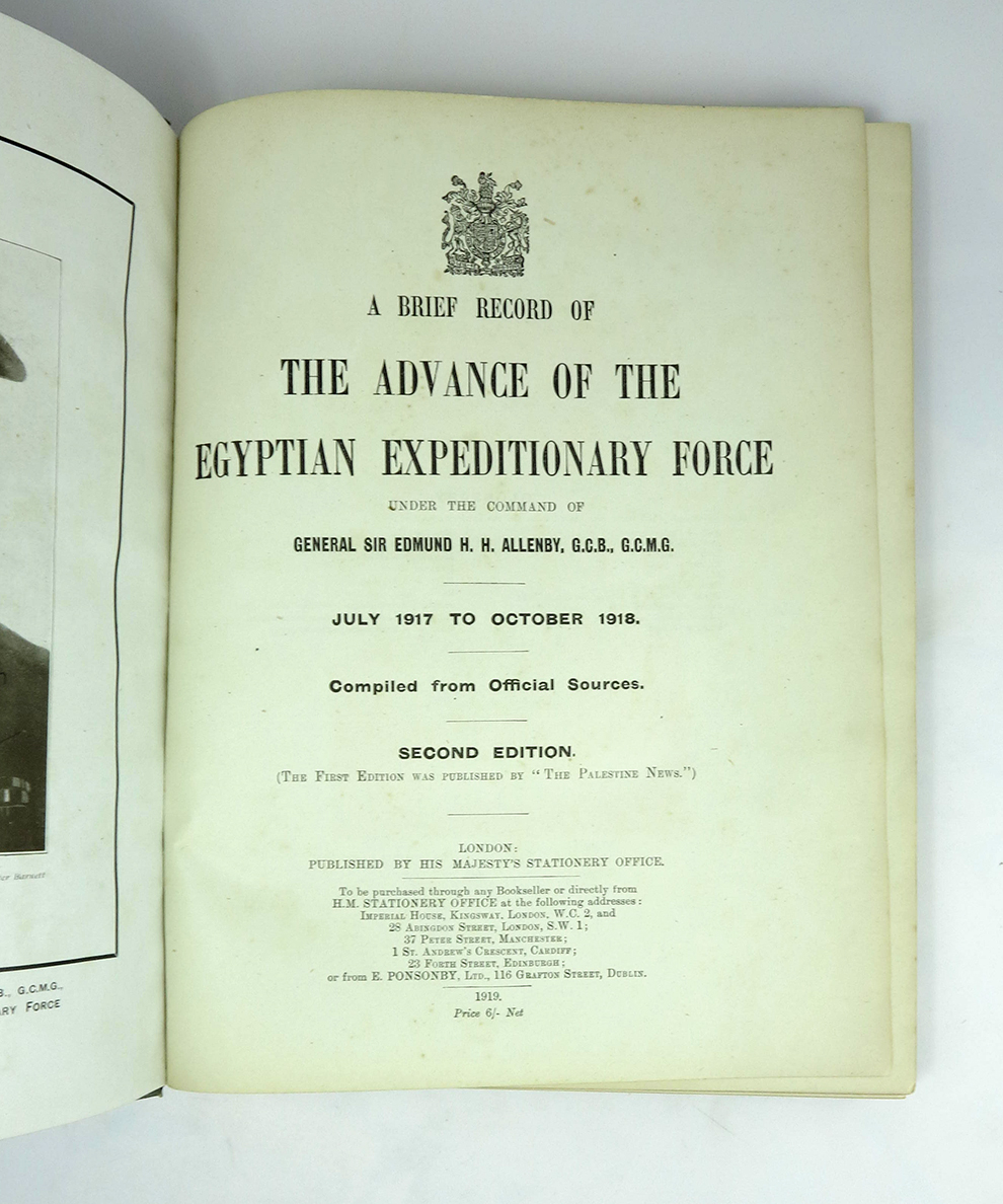 Second Edition. Quarto. pp., 113. Publisher’s blue quarter cloth and buff paper boards. Author portrait frontispiece and 56 full-page chromolithographic maps with facing commentary pages. Title printed to upper cover, imprint to lower cover. With Allenby’s signature loosely inserted. Clipping of poem ‘The Red-House Garden. Wadi Ghuzee, before Gaza, Palestine, Summer, 1917’ mounted to rear paste-down. Covers scuffed; corners rubbed; spine head rubbed. Ownership inscription of ‘R. J. Harrison 1919’ to front free endpaper.