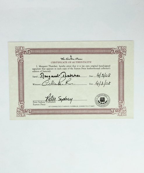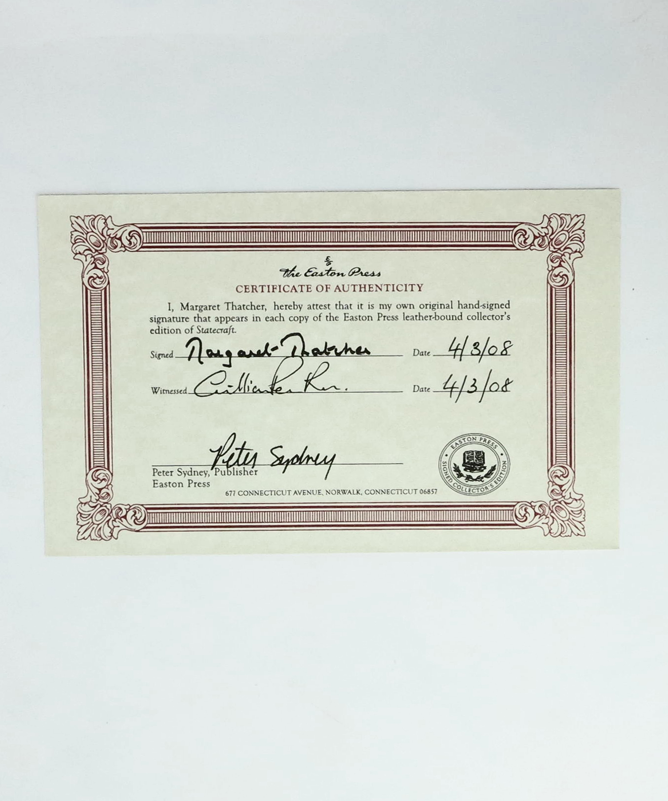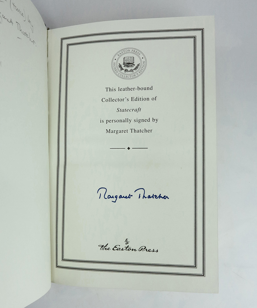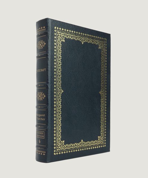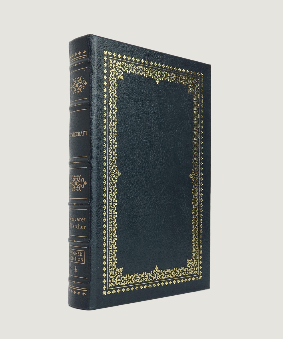SIGNED First thus. Octavo, pp., xxv 486. Publisher’s navy morocco leather with gilt title to spine, gilt decoration to both boards, six raised bands to spine, all edges gilt and a gold ribbon bookmark. Signed by Margaret Thatcher to the first leaf as well as to the Laid-in Certificate of Authenticity. Slight spotting to upper edge of pages.