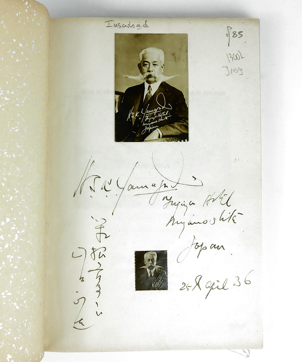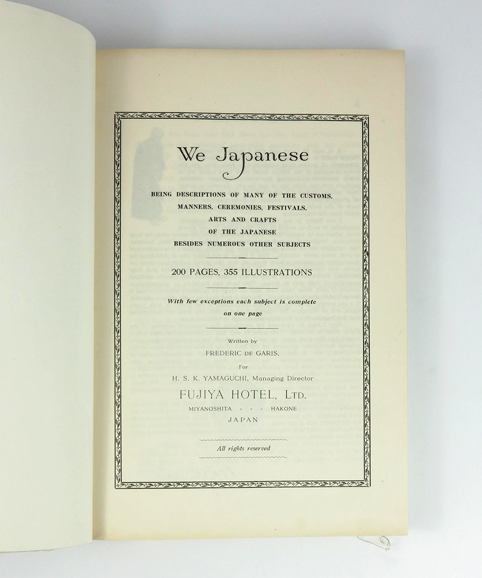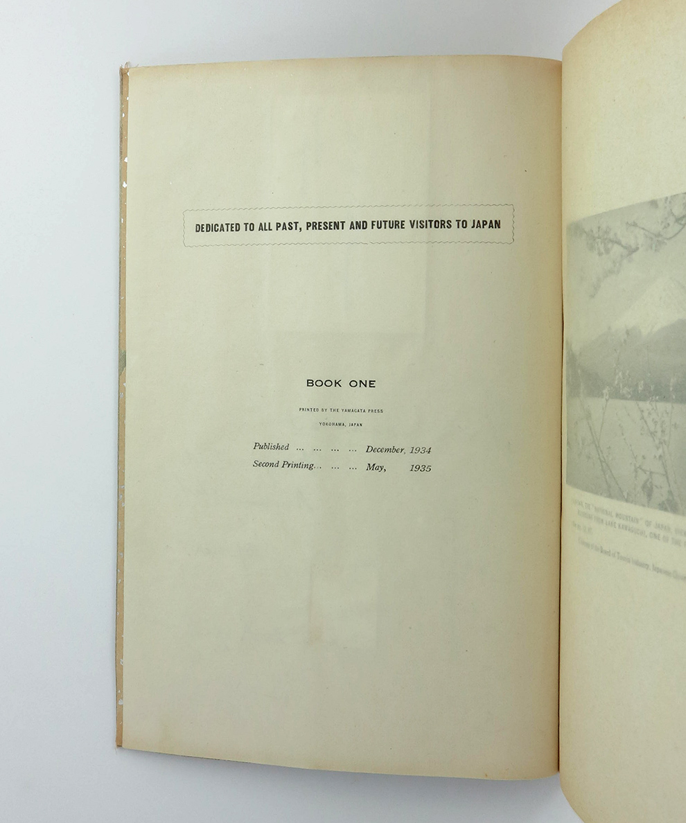 First Edition, second printing. Octavo, pp., 201, with tissue-guarded frontispiece photograph of Mount Fuji and 350 illustrations throughout the text. Original publisher’s ‘Shibui-style’ limp silk binding, title printed and mounted to upper cover, paste-down end-papers flecked gold. Front free end-paper inscribed in English and Japanese by H. S. K. Yamaguchi, the hotelier who commissioned this volume, with additional photos of Yamaguchi mounted to the same. Trivial shelf wear to tail of covers. Slight, even toning to edges of text, foxing to two leaves only. Lacks the scarce slipcase. A Very Good copy.
