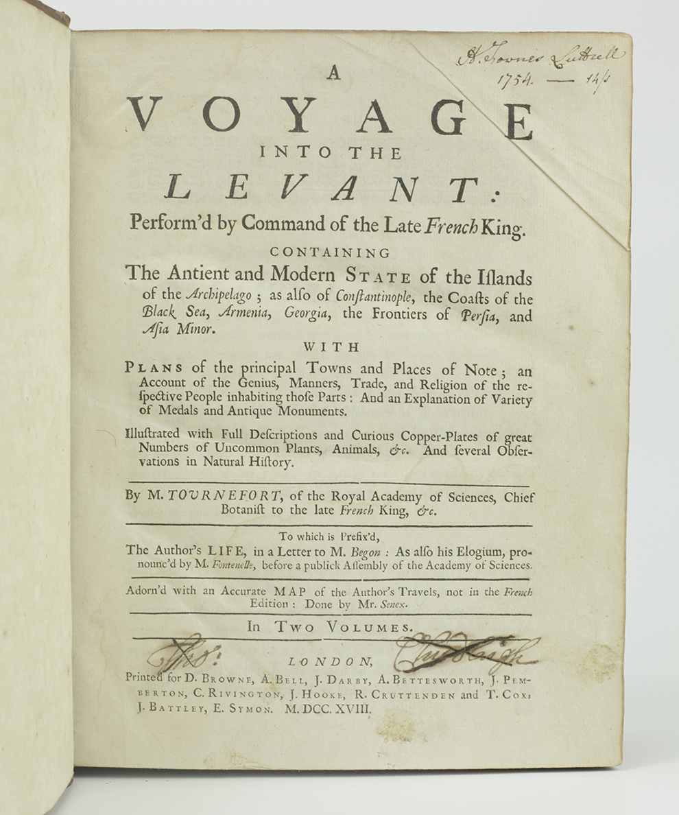 Joseph Pitton de Tournefort was an influential French botanist and travel writer, credited with inventing the word herbarium. These volumes recount Tourneforts extensive voyages to the near- and middle-east. John Senex was an English cartographer, astrologer and geographer to Queen Anne. Illustrated with a panoply of plates which depict a rich, broad variety of views, plans, plants, animals, antiquities, and aspects of everyday life.