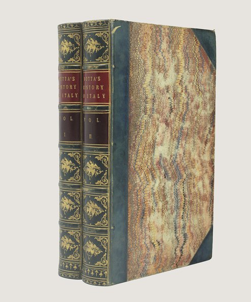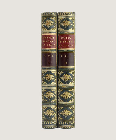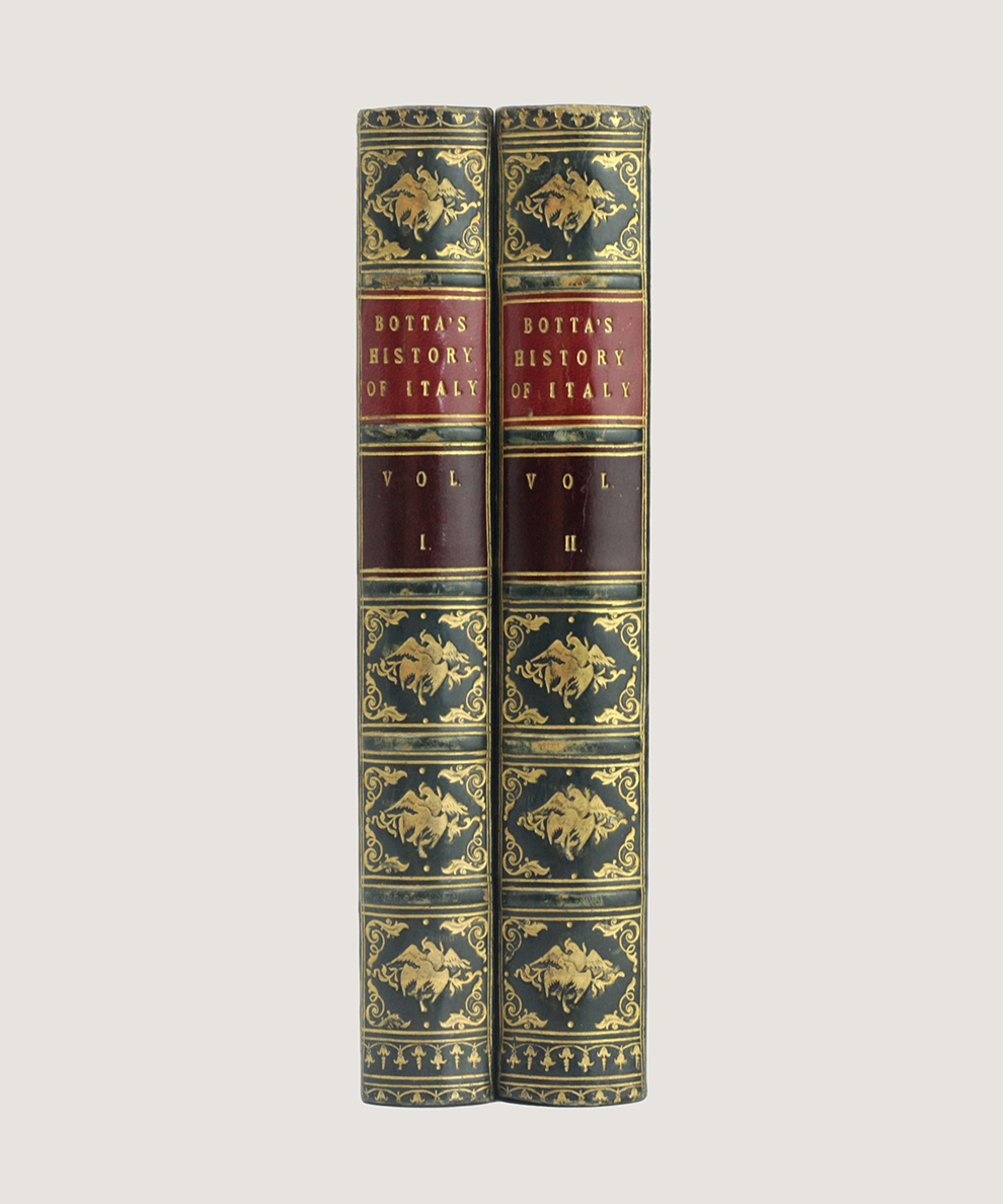 First Edition in English. Octavo’s, pp., xx, 396; viii, 464, including pp., 12 Index to vol II. Polished navy blue half calf over marbled boards; spines with five raised bands, elaborately gilt with ornaments of two entwined doves to each compartment. The Italian born French historian and doctor Carlo Giuseppe Guglielmo Botta (1766 - 1837) is best known for this history, first published in Paris in four volumes in 1824 as the Storia d'Italia. Much of the work is drawn from Botta’s own eye witness experiences. Arrested in Italy as a spy for the French in the aftermath of the Revolution, after a year’s imprisonment, Botta fled to France, where he remained for the rest of his life. Rare.