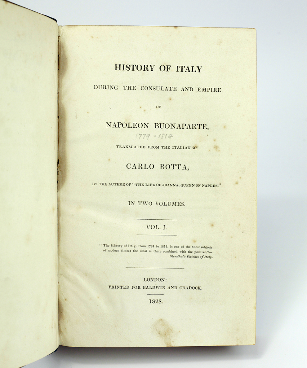 History of Italy During the Consulate and Empire of Napoleon Buonaparte [sic]; Translated from the Italian of Carlo Botta, by the Author of "The life of Joanna, queen of Naples."