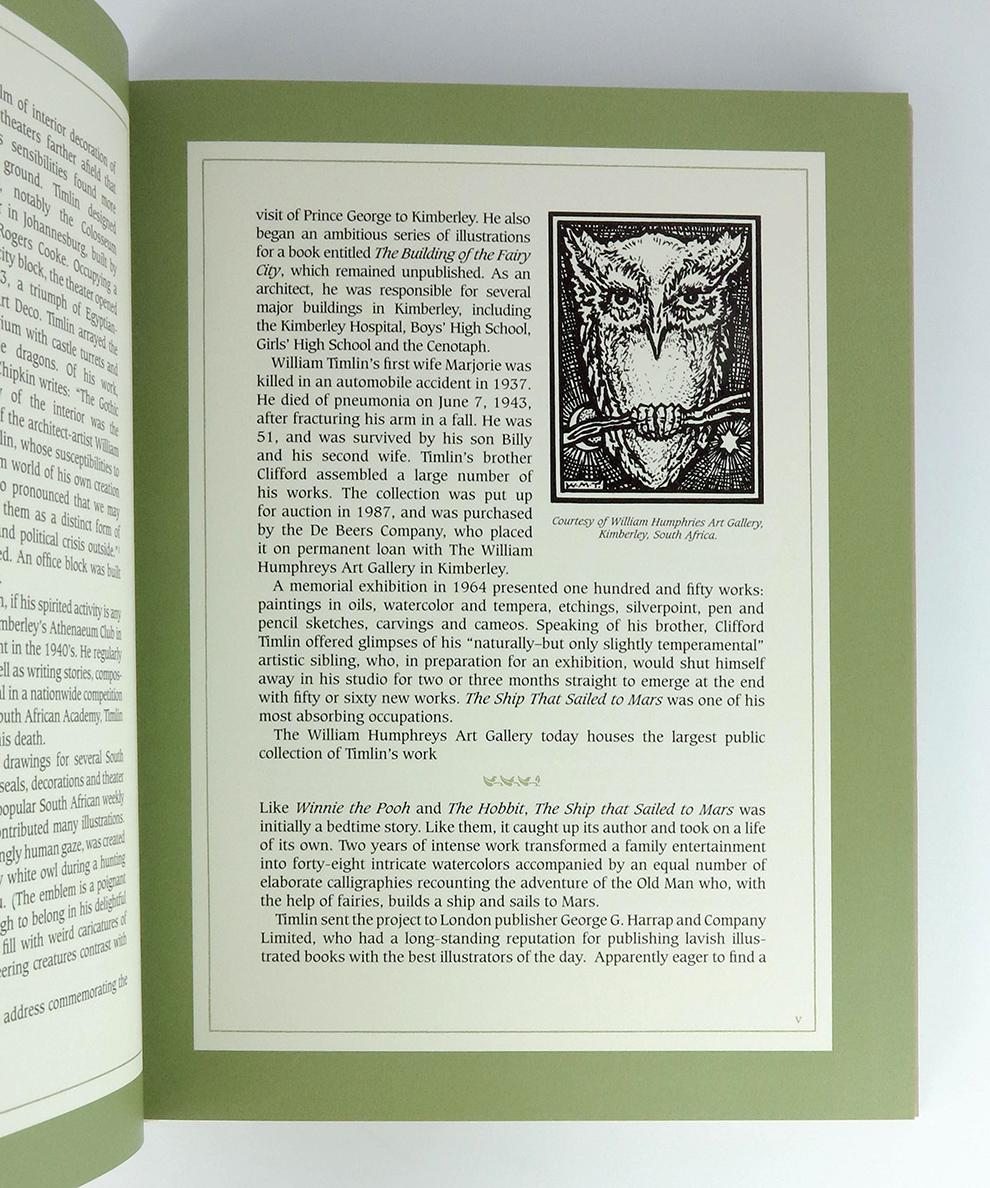 Inimitably written and illustrated by Ashington born architect and artist William Mitcheson Timlim “The Ship That Sailed to Mars” is his only published children’s book. As well as designing important buildings in the South African Kimberley district, Timlin worked as the artist on numerous travel books but “The Ship That Sailed to Mars” is recognised as his masterpiece and a fantasy classic. Originally written for his son, the beautifully illustrated tale has been described as the most original and beautiful children’s book of the 1920s, while Alan Horne states that it puts Timlin in the top ten fantasy illustrators along with Rackham and Dulac. This 2011 facsimile features a new introduction from John Howe providing an overview of Timlim’s life and history. Heavyweight, so an additional postage contribution may be requested for shipping to overseas addresses.