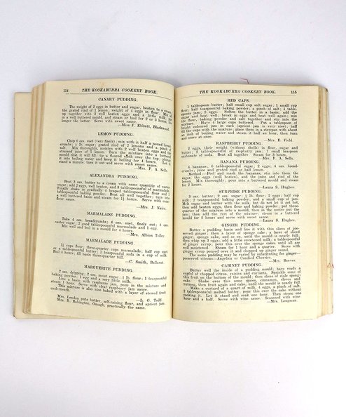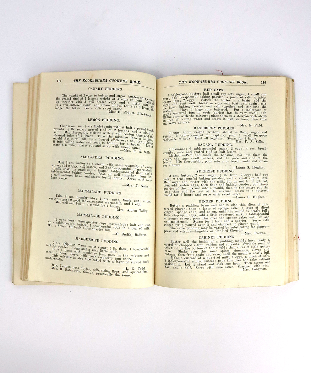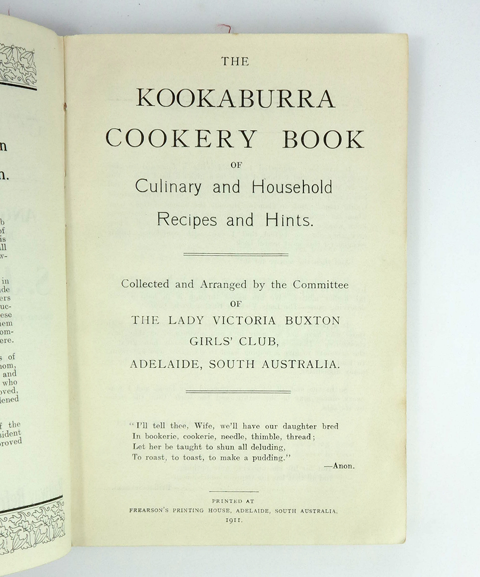 A rare and charming book of recipes and domestic tips, all of which are attributed to the various members of the Ladt Victoria Buxton Girls’s Club. The recipes within range from French haute cuisine such mouton a la chasseur and chaudfroid of chicken, to West Indian curries and soups, to Australian classics such as an early version of fairy toast, Sally Lunn, damper, lamingtons, kangaroo tail soup, Billy tea, and rissoles. A fascinating insight into early Australian cuisine.