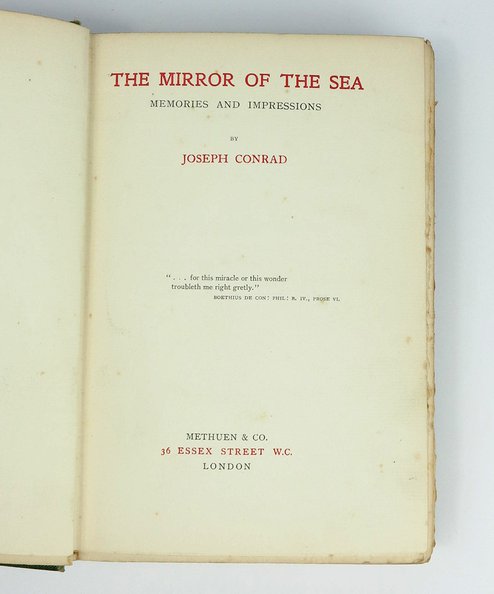Conrad’s first volume of non-fiction. An unusual and continuous reminiscence of the author’s time at sea. Scarce in the untrimmed state, as copies for libraries were issued trimmed.