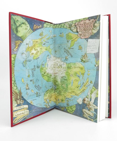 FIRST thus. Octavo, pp., 285. Publisher’s faux quarter-leather over red cloth. Gilt titles and decoration to spine, gilt titles and decoration to upper board, gilt insignia of the world turtle to both boards with a pictorial stamp of Rincewind to upper board. Pictorial end-papers depicting a map of Discworld. Brown silk place-mark ribbon.