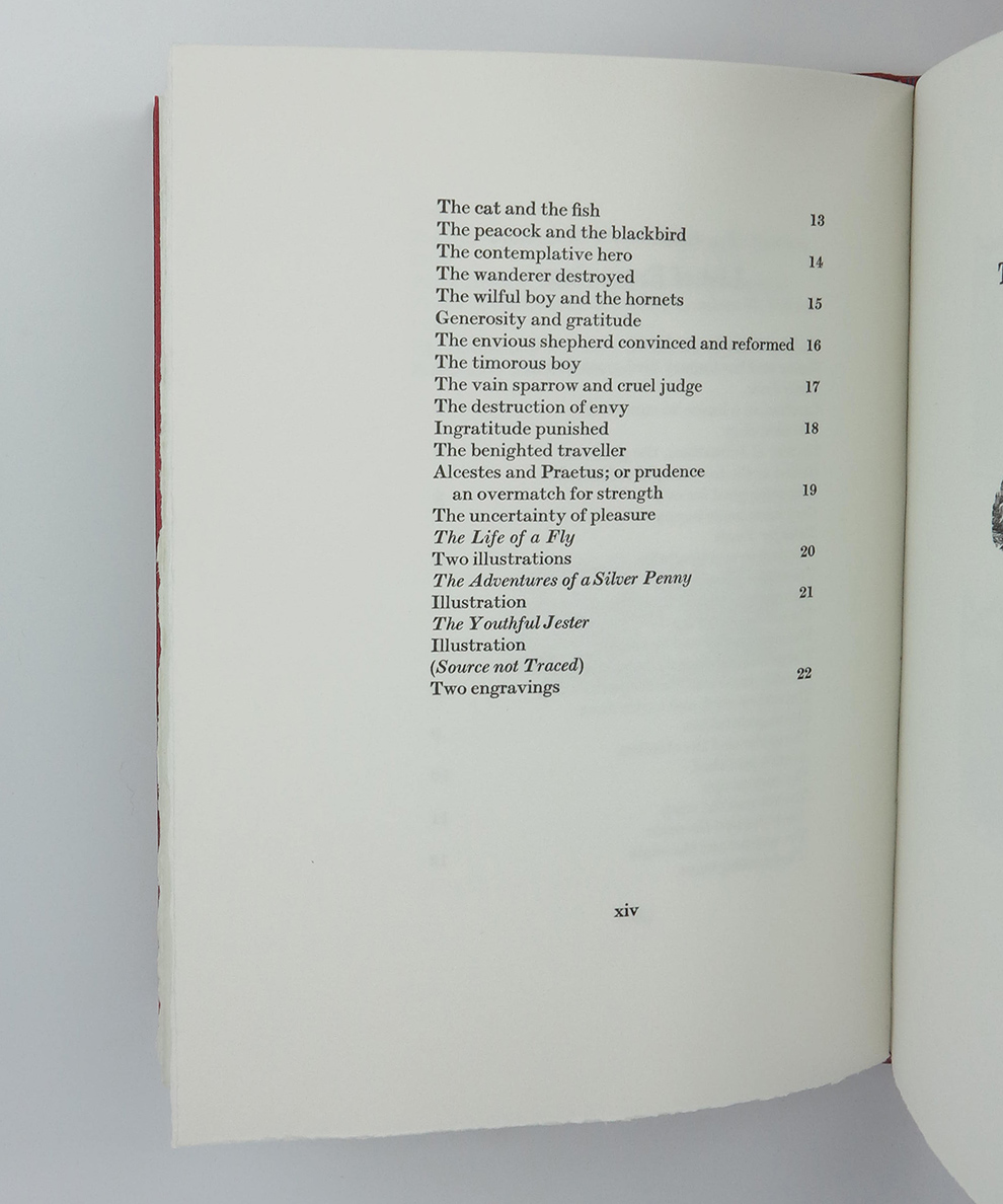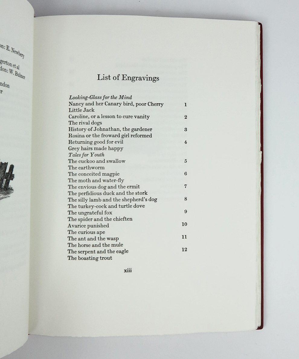 One of twenty-five copies only bound in full morocco, of a limitation of 140 copies. Quarto, pp., frontispiece, xiv, [2], 22 of wood-engravings printed to rectos only, [1] blank, 23-24 bibliographical note, [1] blank, [1] colophon, [2] blank. Ornamented gilt to boards, title in gilt to spine, fore-edge and lower edge uncut. Felt-lined crimson slip case. Printed on handmade B. F. K. Rives Cuve Velin paper. Spine lightly sunned, very light minor foxing to edge of end-papers. A very good copy.