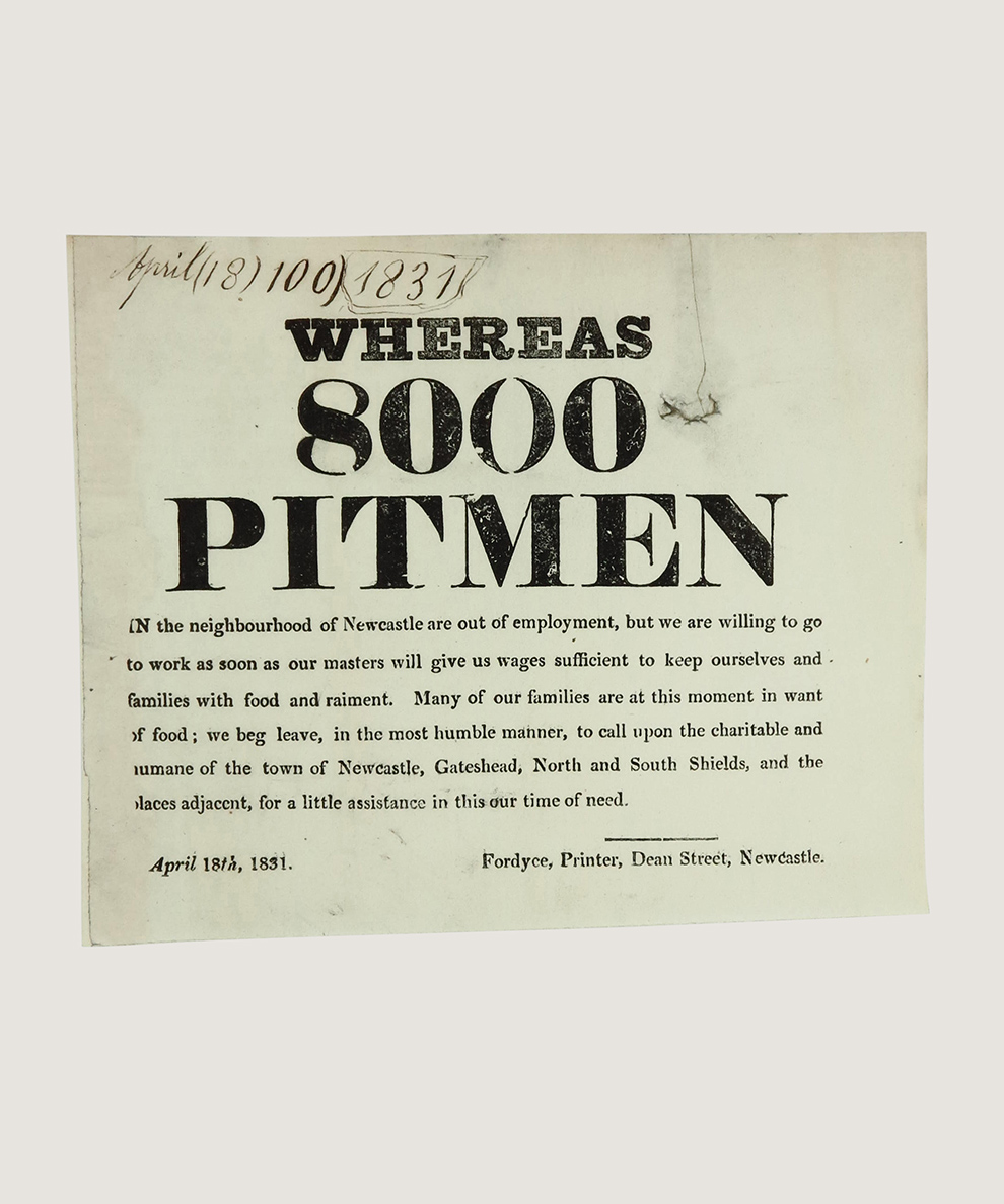Handbill voicing the demands of trade unionist miners towards their employers, and requesting aid from local residents. The handbill was produced in the context of workers of ‘Hepburn’s Union’ engaging in a strike in 1831, which was ultimately successful, and would go on to be the model for other miner’s unions.