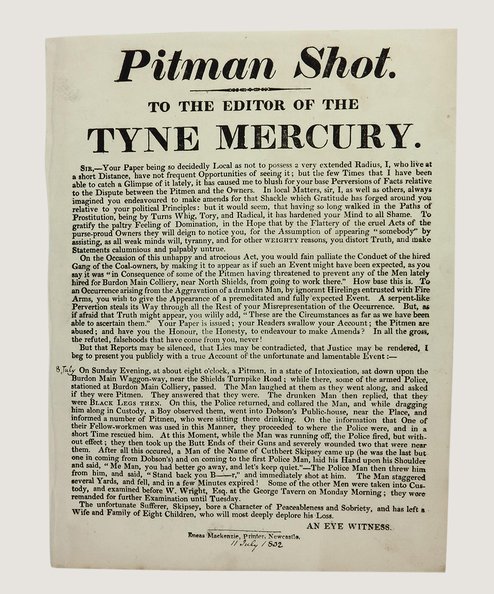 account by ‘an eye witness’ goes into great detail about the incident. The constable responsible, George Weddell, was arrested, found guilty of manslaughter and sentenced to six months hard labour. Skipsey had eight children and his last son, Joseph (who was only four months old at the time of his fathers death) is better known as one of the pitmen poets, and a leading light in labouring poetry of the nineteenth century. Dated in contemporary hand. Rare, quite possibly unique.