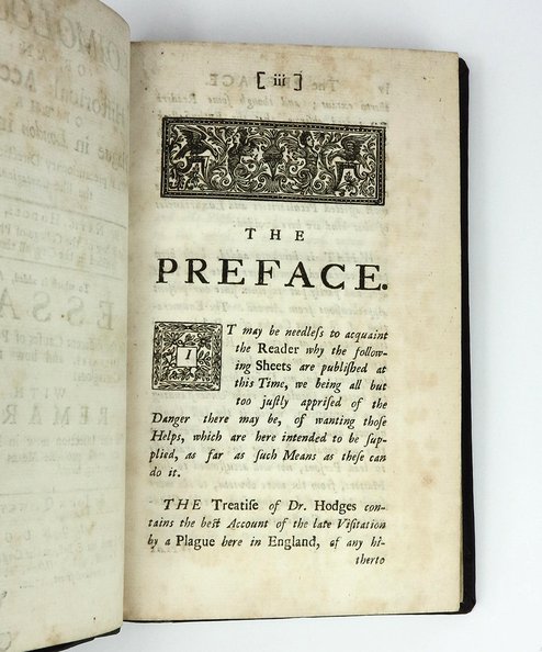 English translation of the 1672 Latin original, which one of the most exhaustive accounts of the Plague Year of 1665-6. One of the key sources for Daniel Defoe’s ‘Journal of the Plague Year’ (1722). This volume, unlike Defoe’s novel, is factual. Hodges was medical advisor to the City of London, his biographer writes ‘Hodges's insistence on staying in London during the plague is an action for which he has been all but canonized by medical historians; his account of his practice in this period, cautiously used, remains one of the best sources of information on the medical and social effects of this disease’. The folding “Table of the Funerals in the Several Parishes within the Bills of Mortality of the City of London, for the Year 1665” totals 28,888 recorded plague victims for that year.