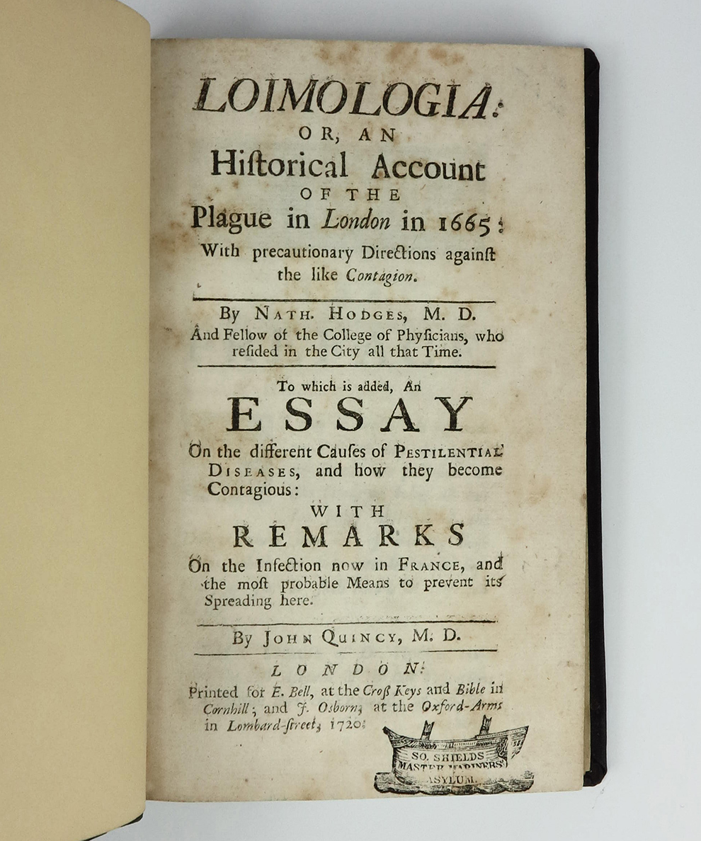 Second English edition, with the comma after ‘Bell’. Octavo, pp., vi, 288, plus folding table of plague deaths in the City of London. Library quarter rexine on textured cloth by Chivers, titled in gilt to spine, edges mottled blue. Bookplate of South Shields Public Libraries to front paste-down, cymbiform ownership stamp of South Shields Master Mariners’ Asylum to title-page, a dozen or so unobtrusive South Shields library stamps throughout. Shelf-wear to spine tips, top edge dusty. Light scattered foxing to prelims, and very occasionally to further select leaves. A very good copy with the unusual provenance a seafarer’s almshouse library.