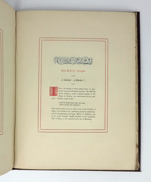 One of 54 tracts published by Denham on local folklore between 1846 and 1859. Each was printed in an edition of 13 to 50 copies, and this is therefore reported as one of ‘a few copies 4to’. The Richardson press was unusual in both creating its own ornaments and decorated initials, and in focusing on coloured typography. The Richardsons’ distinctive style is on full display here. The antiquary and author W. H. Longstaffe is best remembered today for his 1854