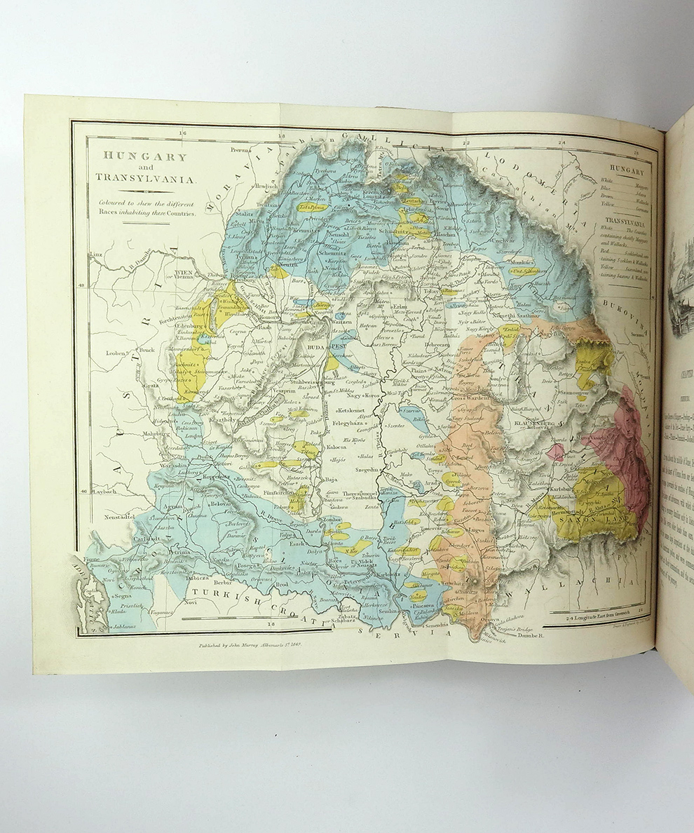 Second Edition. Octavo, two vols: pp., xxiv, 560, tissue-guarded frontispiece, fold-out colour-printed map of Hungary and Transylvania, and numerous illustrations within text, as called for; xii, 553, [1] blank, 16 publisher’s ads, tissue-guarded frontispiece, 1 engraved plate, and numerous illustrations within text, as called for. Volume 1 in original publisher’s emerald cloth by Remnant and Edmonds, blind-stamped border and ornamentation to boards, titled in gilt to spine; volume 2 rebound in later green cloth, titled to paper spine-label, many leaves unopened in both volumes. Spine of first volume sunned, boards lightly scuffed, corners bumped, joints wearing with slight loss to head. Very occasional light, scattered foxing to prelims and edges of both volumes. Overall, a very good set.