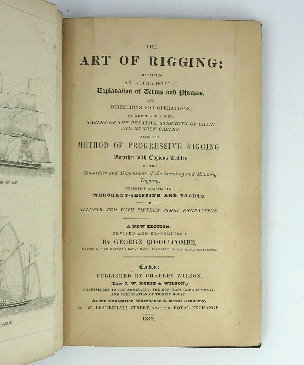 Widely regarded as the finest comprehensive manual on the mastery of ship rigging. Written by the accomplished hydrographer, Captain George Biddlecombe (1807-1878) who was knighted for his service by Queen Victoria in 1873. With an interesting maritime provenance; gift inscribed to J[eremiah] Clarke Richardson (1822-) in year of publication, one half of the Victorian Swansea shipbuilders and brigantine fleet owners, The Richardson Brothers.