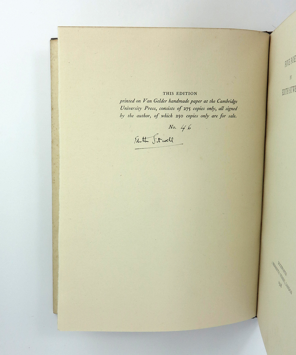 Scarce French symbolist inspired poetry collection by the scandalising English eccentric, poet, patron and literary critic, Edith Sitwell. Printed on Van Gelder handmade paper at the Cambridge University Press and signed to the limitation leaf by the author. Copies are necessarily rare, being limited to 275 copies with only 250 for sale.