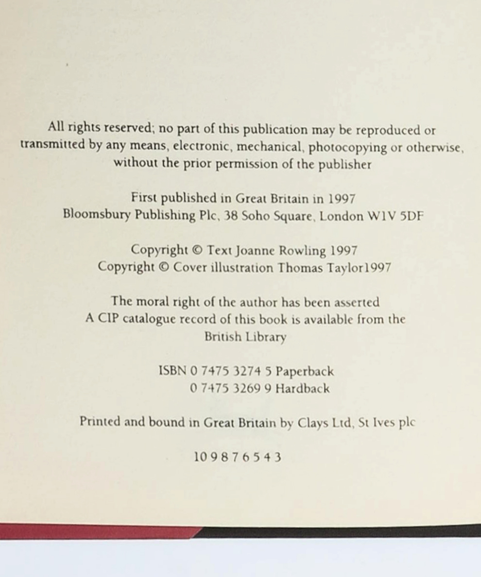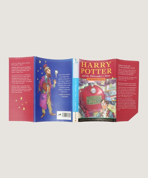 The third impression of the sought-after First Edition of the first Harry Potter story, and the very first to be printed with a dust-jacket (the first and second impressions were both printed without jackets as many were destined for the library service who did not require them). In his bibliography Philip Errington notes that “A report compiled by the printers Clays Ltd, notes that the initial print run (of the hardcover first edition of 500 copies) was ‘followed quickly by a reprint of 1,000 copies and three reprints of 500 copies”. As called for the lower cover of the third impression dust-jacket is purple in hue (as opposed to the blue of the boards), an error that was corrected in later impressions of the jacket. Necessarily rare.