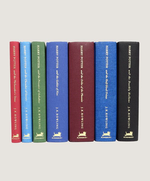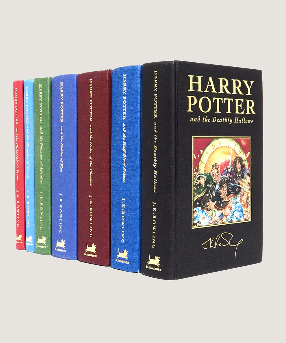 All First Editions Deluxe. A complete seven volume set in harlequin colours of the first printings of the Deluxe editions; with the required 1 - 10 number sequences in each book. Publishers’ cloth with gilt titles to spines and upper board, and square colour pictorial onlay to upper board inside gilt ruled border, above author’s facsimile signature blocked in gilt; all edges gilt; satin place-markers. With ‘Harry Potter and the Prisoner of Azkaban’ inscribed and signed by Chris Rankin (aka Percy Weasley) ‘Sarah, Caput Draconis! Chris Rankin’ to verso of half-title. A near fine set.