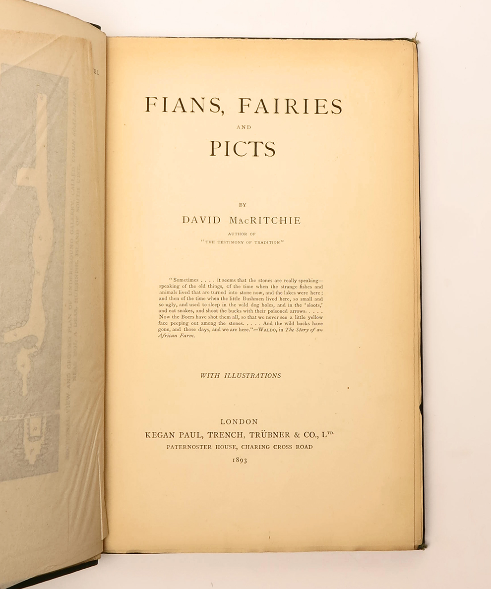The first edition of a central work in fairy research. David MacRitchie was a Scottish folklorist who attempted to apply the Victorian pseudo-science of race theory to fairies, elves, and other fey beings. This work is a significant expansion on his theory of a ‘non-Aryan’ race of ancient, British dwarves, fairies, and elves, that was first proposed in ‘The Testimony of Tradition’ (1890). This copy was formerly owned by the Theosophical Society in Scotland, and was no doubt consulted by many of the leading lights in Scottish folklore.