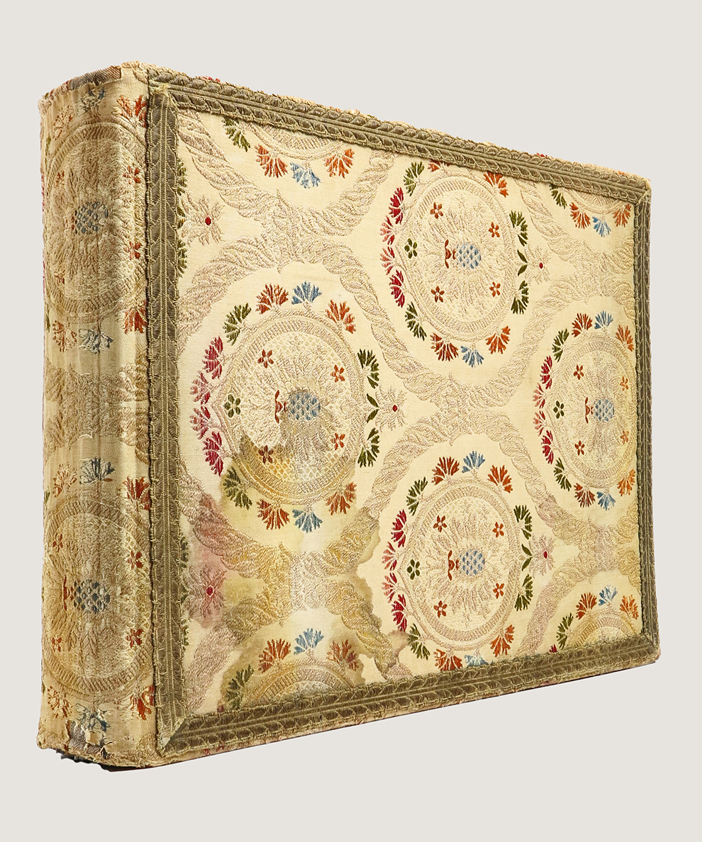 Oblong folio, with 224 photographs mounted to 56 leaves of grey card. Cream cloth over boards by Thummler and Rutherford of San Francisco; embroidered in blue, orange, red, green, and gold thread, within trim border. Minor soiling to upper board, spine-tips and corners rubbed. Two photographs removed but contents otherwise clean, bright, and fresh.