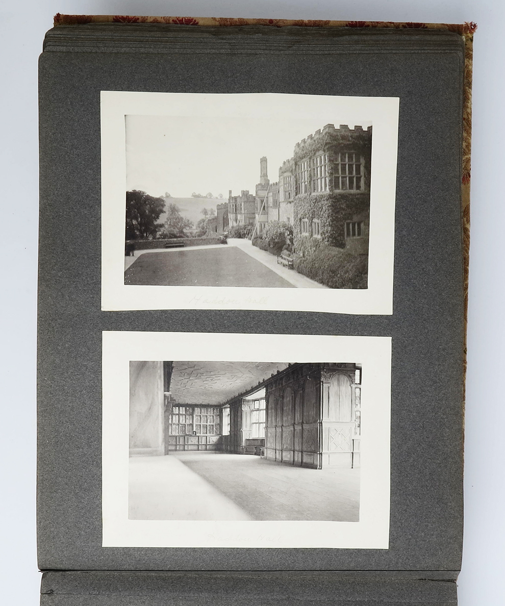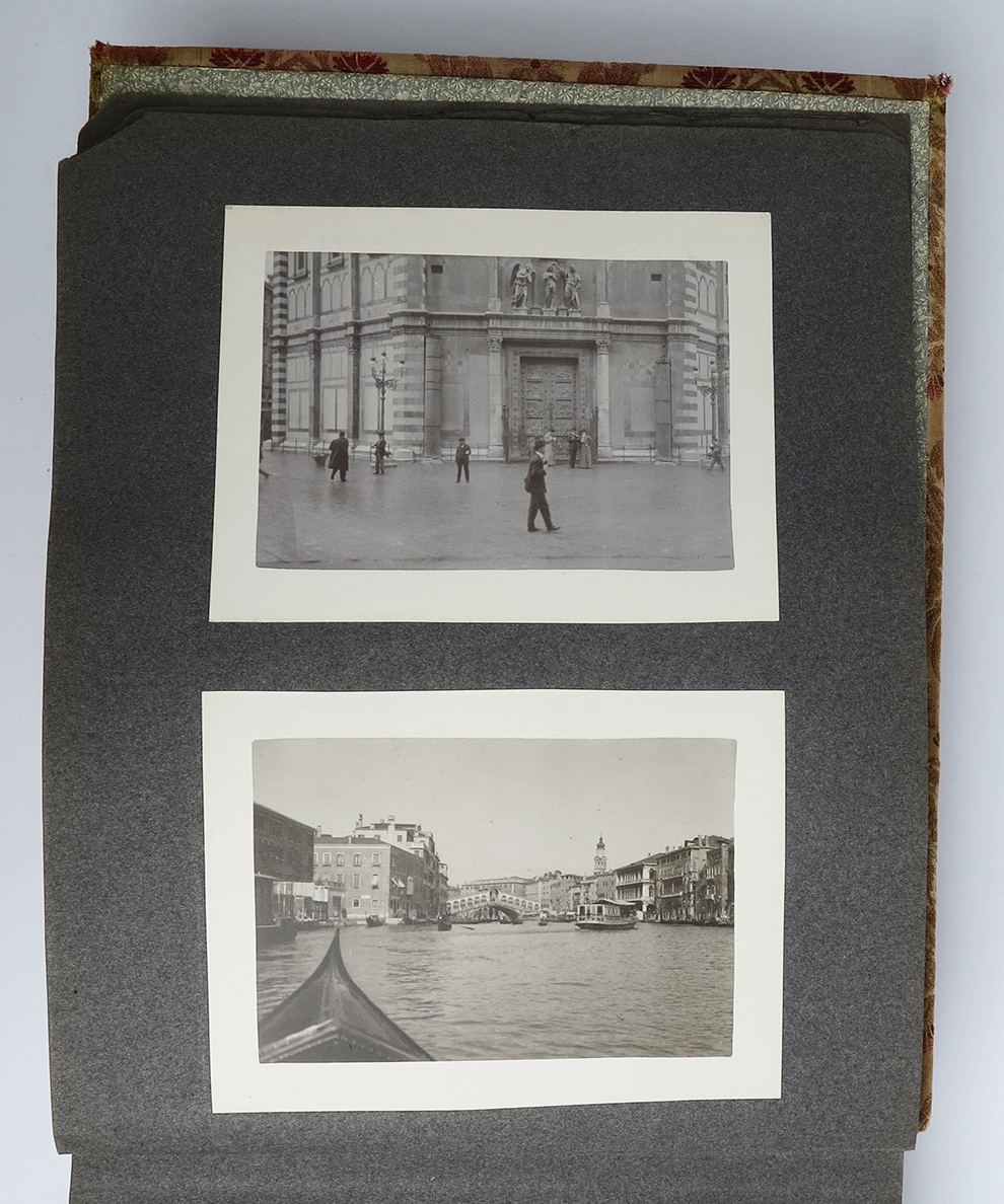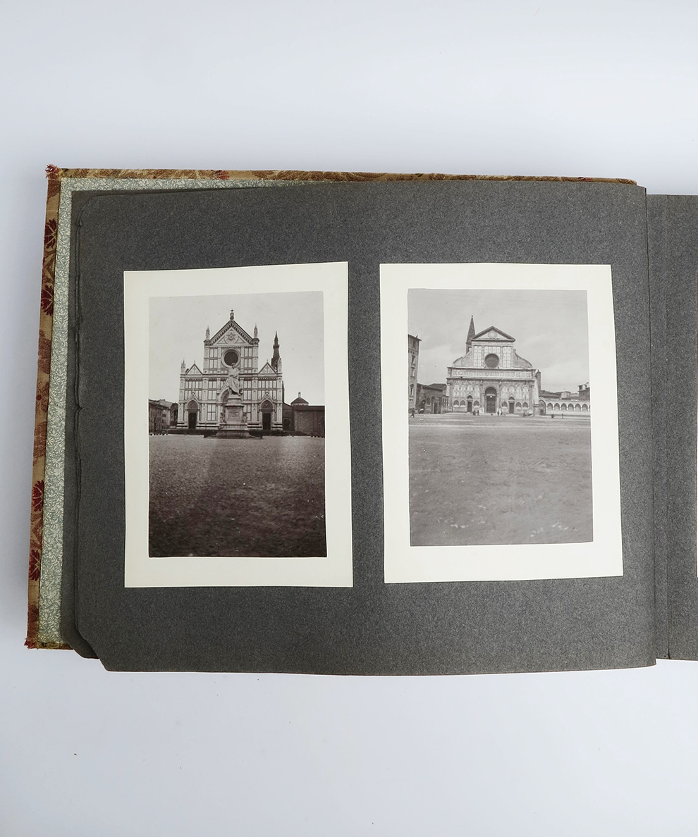 A highly elaborate and handsome photograph album from a talented amateur, likely of a single ‘Grand Tour’ around Europe. Includes photographs of Il Duomo, Florence; the Doge’s Palace and Bridge of Sighs, Venice; Anne Hathaway’s Cottage and Shakespeare’s birthplace, Statford-upon-Avon; Warwick Castle; the Seine; Caernarvon Castle; the landscape of Skye including the Fairy Glen; the Forth Bridge; Stirling Abbey; Edinburgh Castle, and Holyrood. As well as touristic sights, the photographer had an eye for street scenes of the towns they visited, and some of the photographs show unusual intimacy for a photographer of this period. We get a sense of the modes of travel used on the trip, with one photograph illustrating the close quarters of a train carriage, others showing the car used by the travellers in Scotland, and another showing ships at sea. Posed and close-up photographs feature women only, suggesting this may have been an album taken by an early female photographer. With the book binders label of Thulmer & Rutherford of San Francisco to front paste-down. This is, therefore, a substantial photographic account of (likely American) women travelling around Europe at the turn of the century.