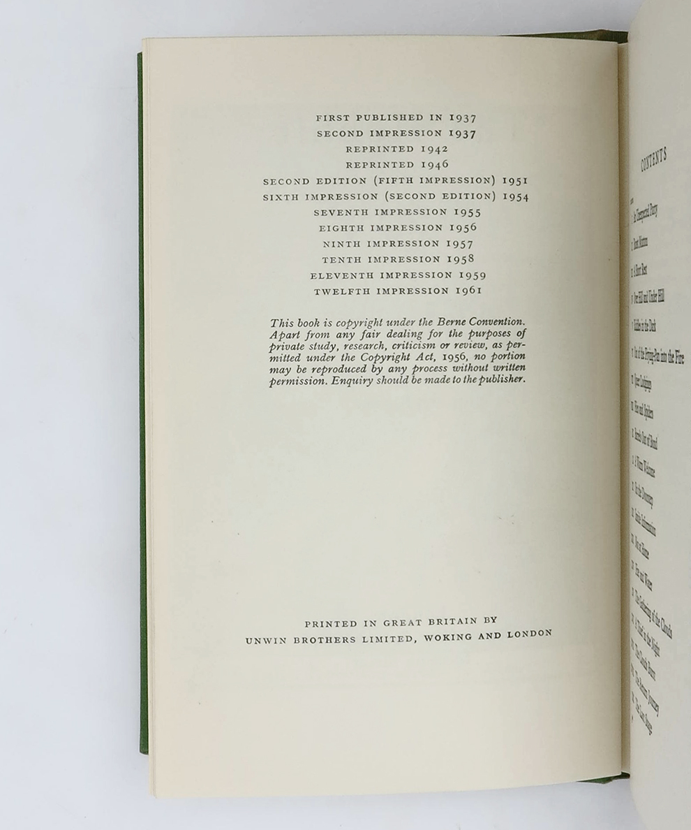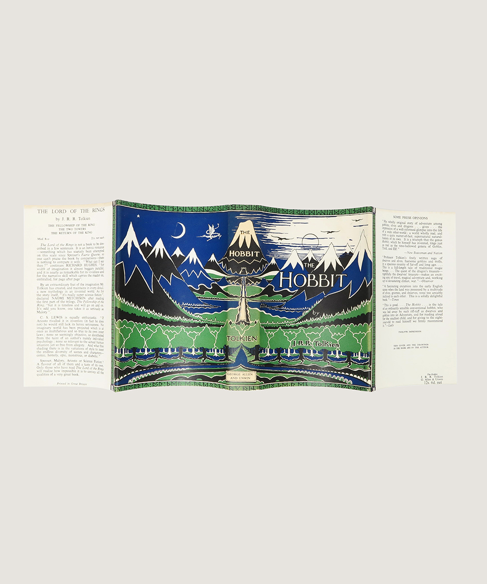 Second Edition (Twelfth Impression overall). Octavo, pp., 315, [1]. Colour frontispiece and eight monochrome illustrations by the Author, plus Thror’s Map to front endpapers and Map of Wilderland to rear endpapers. Publisher’s decorative forest green cloth with black titles and illustrations, in the iconic green, blue, black and white, pictorial dust-jacket also illustrated and designed by the author. A small bump to the top edge of the upper board and a tiny amount of sunning (through the jacket) to the spine. The unclipped dust-jacket has a tiny amount of rubbing to spine tail but is otherwise fine. An incredibly well preserved copy that appears unread, near fine.