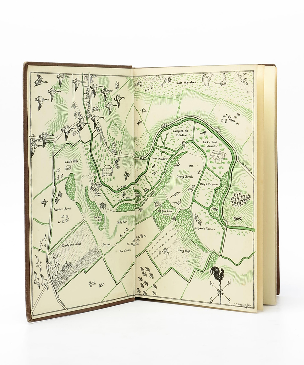 First edition, first printing in second printing dust-jacket. Octavo, pp., 402, [2] epigraph. Complete with frontispiece and eleven full-page illustrations within the text. Publisher’s chocolate cloth, titled in gilt to spine. End-papers maps of the environs of the farm in green and black by C. F. Tunnicliffe. Publisher’s original unclipped buff jacket, titled in green to spine and upper panel, blurb to lower panel. Dust-jacket nicked to foot of spine, sympathetic paper repair to verso of head and lower panel, lower panel soiled. Patch of staining to cloth to foot of spine, corners lightly bumped with shelf-wear to extremities. Contents slightly toned, one page dog-eared, but generally neat. A solid, square copy. A good copy in very good jacket.