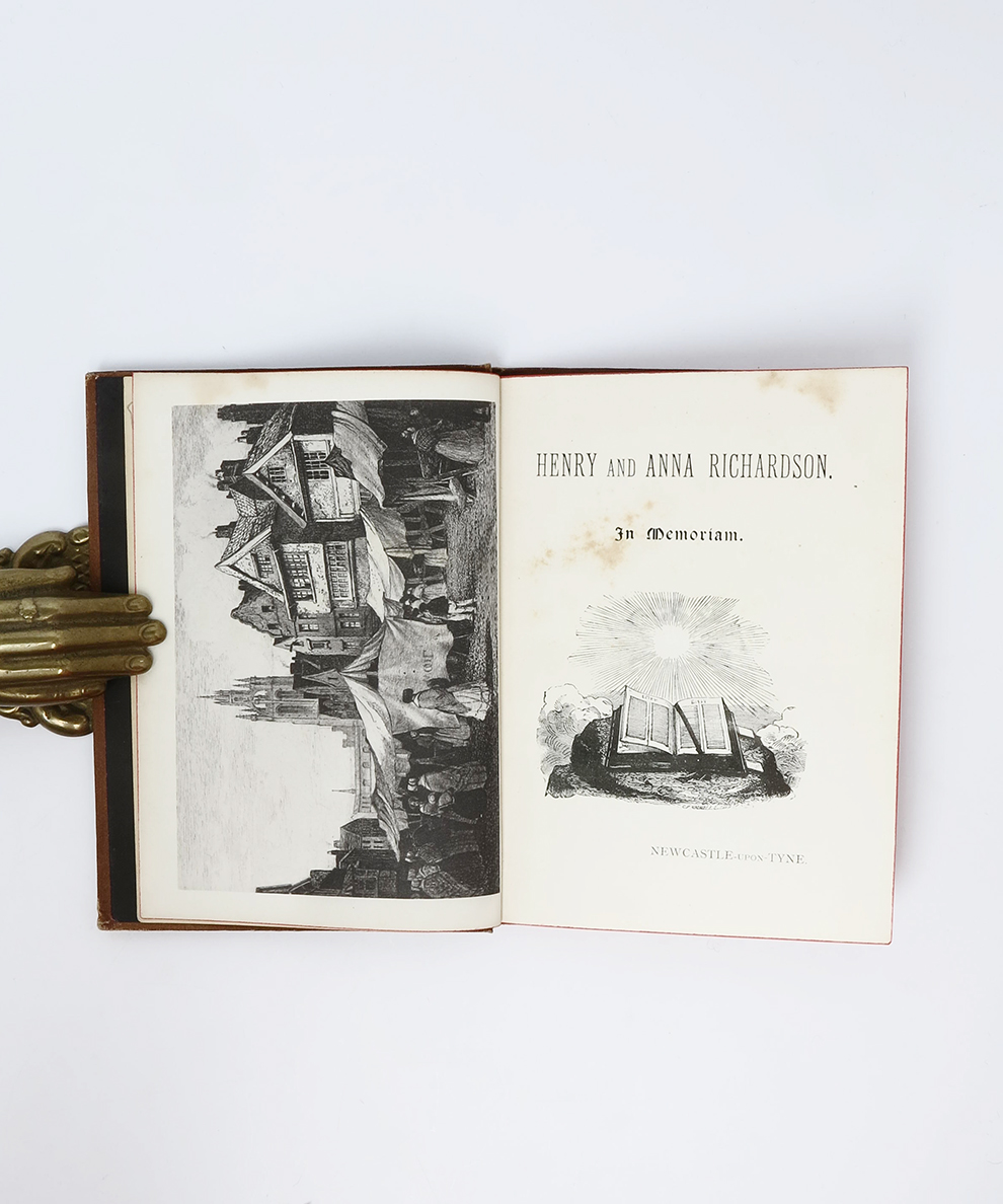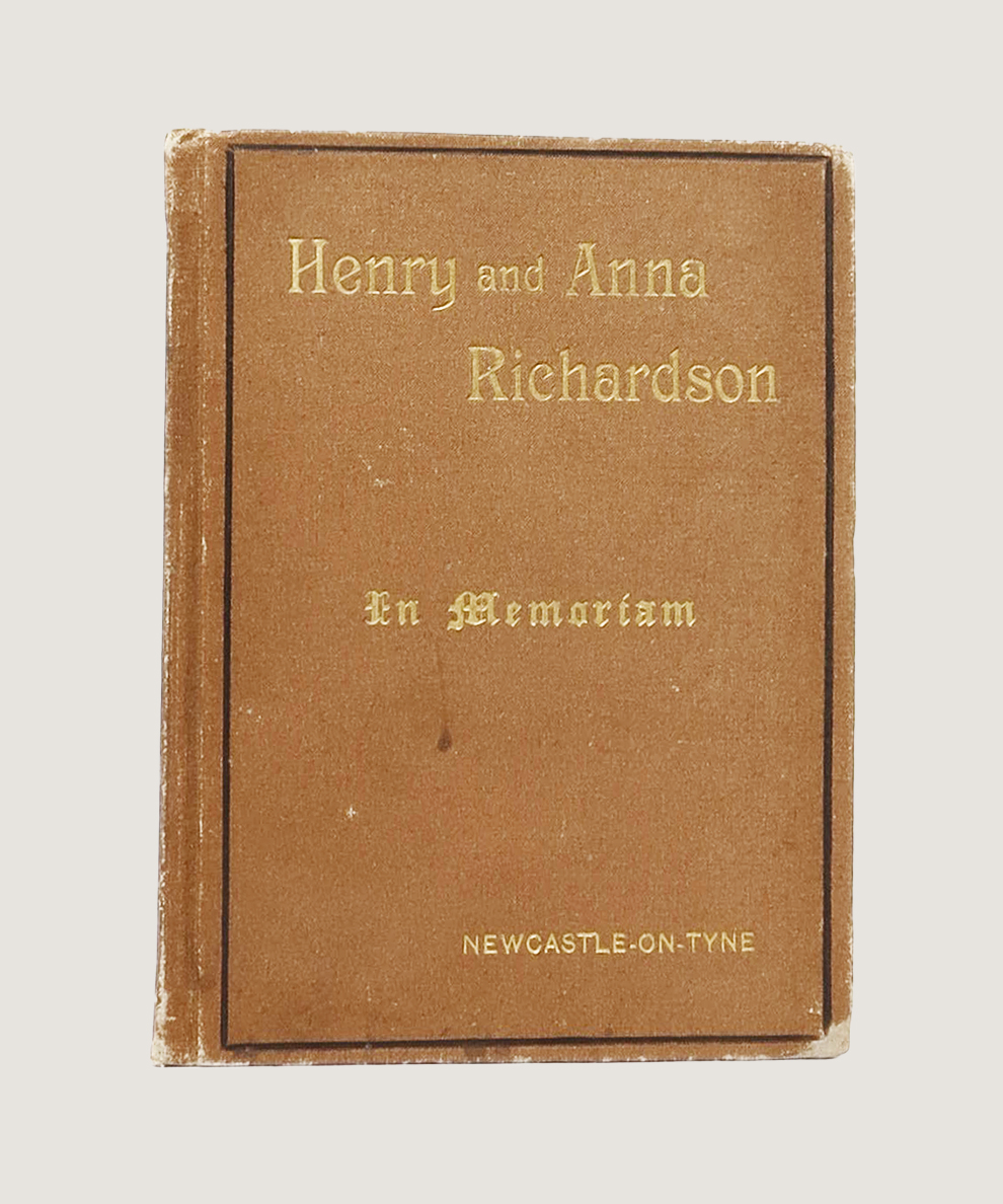 An exceedingly rare memorial volume for two prominent Newcastle Abolitionist Quakers who in 1846, paid the deed of enfranchisement for Frederick Douglass. Henry and Anna Richardson were grocers and Quakers, who were lifelong advocates of Abolitionism, peace, and ethical trade. The couple, along with other British Quakers, financially supported Douglass’ two-year speaking tour of the UK, and hosted the Abolitionist at their home in Summerhill in Newcastle. In 1846, the couple raised £150 to purchase Douglass’ freedom from his American owner, Hugh Auld. The act was not without controversy, as some Abolitionists viewed the purchase as tantamount to validating the trade in enslaved people. Douglass corresponded with the Richardsons for the rest of his life. The Richardsons regularly hosted black Abolitionists such as James W. C. Pennington and Henry Highland Garnet at their home. Through local presses, the pair supported the publication of anti-slavery prints, broadsides, pamphlets, and two books. In 1849, Henry and Anna sailed to Paris to attend the General International Peace Congress alongside Elihu Burritt, Victor Hugo, William Wells Brown, and other major radical figures from across the world. This volume, compiled by friends and family in the year of Anna’s death, celebrates both their abolitionism and their peace activism. A section recalling their time with Douglass partially reproduces the deed of enfranchisement. In describing the route of the Richardson’s lives, this short memorial work describes their various encounters with black Abolitionists, with original material from Henry Richardson’s journal.