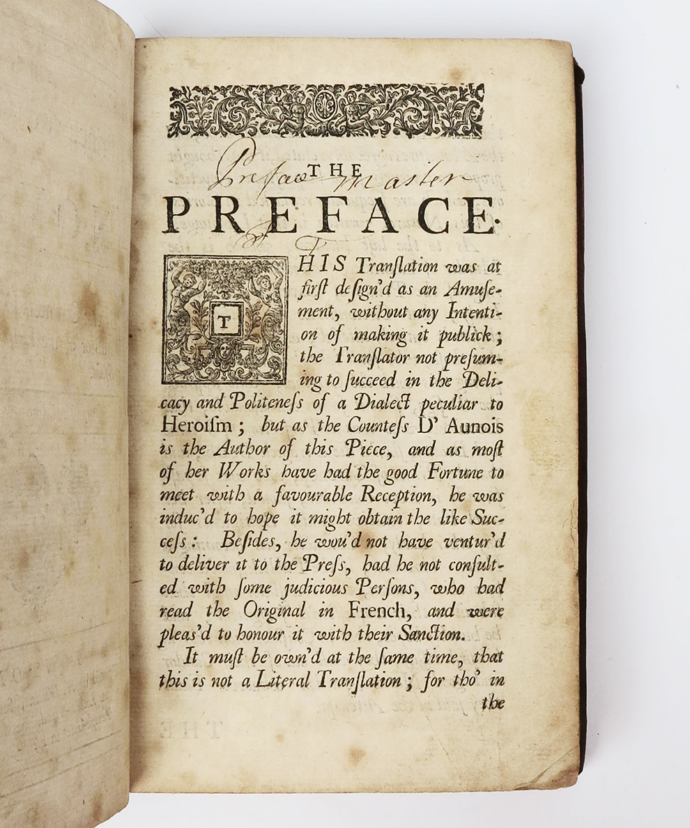 Carency is better in English than in French’ (Palmer, 246). D’Aulnoy was a significant figure for the development of the English novel who was long overlooked. Writing originally in French in the mid-seventeenth century, D’Aulnoy was an author of fictive ‘memoirs’ which claimed to reveal sex scandals at the courts of European monarchs, including the court of Charles II, as well as a writer of fairy tales (she originated the term). Her epistolary works were recognised as novels by her contemporaries, as Lady Mary Wortley Montagu noted ‘Would you have me write novelles like the countess D’Anois? and is it not better to tell the plain truth?’ (Complete Letters, I.293). She was long regarded as a peddler in false gossip and hoaxes, and was only reappraised in the latter half of the twentieth-century as a precedent to the English novel. As the first scholarly treatment of D’Aulnoy argues ‘she was indeed moving towards [Samuel] Richardson: Pamela’s grandmothers were women like Mme D’Aulnoy’s Julia of Warwick, Leonida of Velasco, the Countess of Devonshire, and Doña de Castro’ (Palmer, 247). Her influence on professional women writers was profound. Delarivier Manley explicitly referenced D’Aulnoy as a ‘heroine’, and D’Aulnoy’s narratives of sex and scandal provided the ‘aesthetic ground’ for Aphra Behn and Eliza Haywood (Ballaster, 42). A rare work of romantic fiction by one of the great influences on the development of the early English novel.