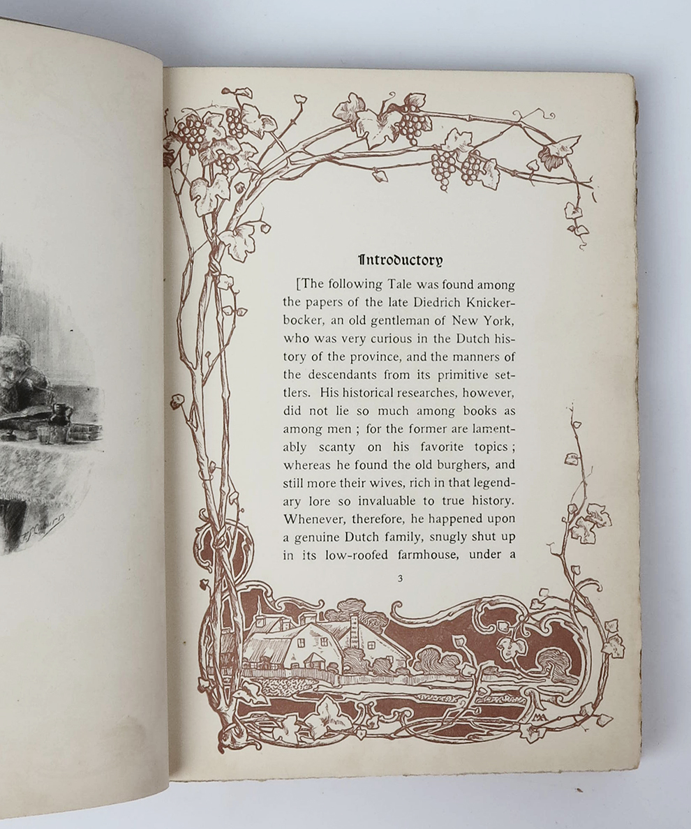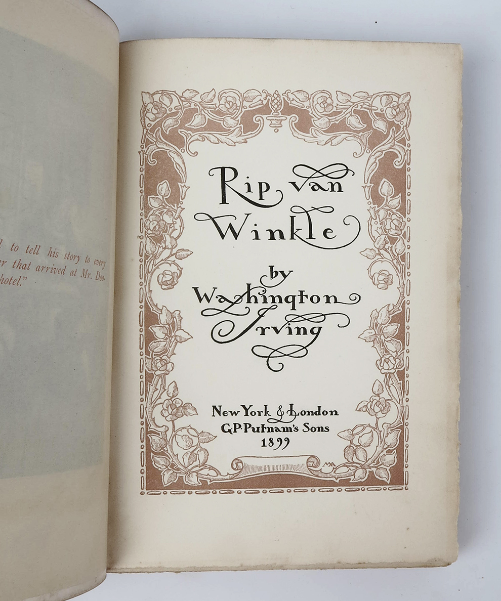 A superb Art Nouveau-style copy of one of the essential American fairy tales, designed one of the most celebrated American book designers of the fin-de-siècle. Margaret Armstrong (1867-1944) was ‘the most accomplished and productive American book designer of the 1890s and early 1900s’ (Lowell Thing ‘The Life and Art’). Her distinctive Art Nouveau style was both pioneering and highly influential, and was much imitated. An expert in botany, and book design more generally, she is best known for her artistic trade bindings produced for the American publishing industry. Her works were exhibited, both within her lifetime, and into the present day, at the Grolier Club, the Metropolitan Museum of Art, and the Library of Congress. Few designers of publisher’s cloth have enjoyed such celebration. The cloth on this edition of Irving’s