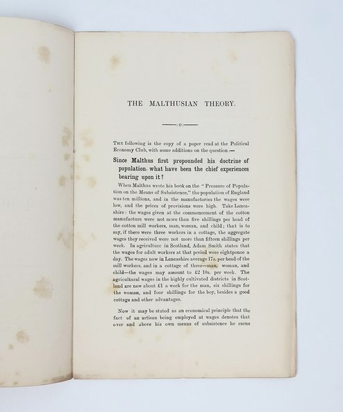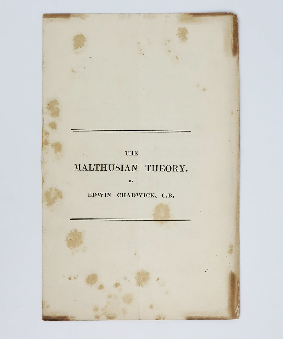 Edwin Chadwick (1800-90) was a friend of John Stuart Mill and Jeremy Bentham, for whom he worked as a literary agent. Chadwick was a reformer of public health and sanitation, a progenitor of the Fabians, whom Mill called one of the ‘organising and contriving minds of the age’. Appraised by his biographers as a singular force in the creation of the Public Health Act (1848), ‘his achievements live on in every home and under every street in Britain’ (ODNB). The Political Economy Club, founded in 1821 by Mill, is the oldest surviving economic debating society. Limited to a membership of 30 only, the Club met regularly at venues across London to debate an economic question. A necessarily rare tract by a significant Victorian reformer on Malthusian economics.
