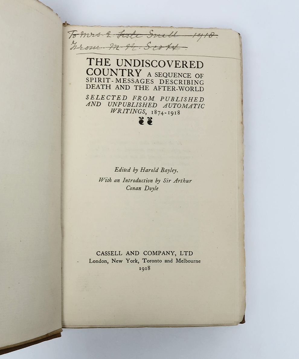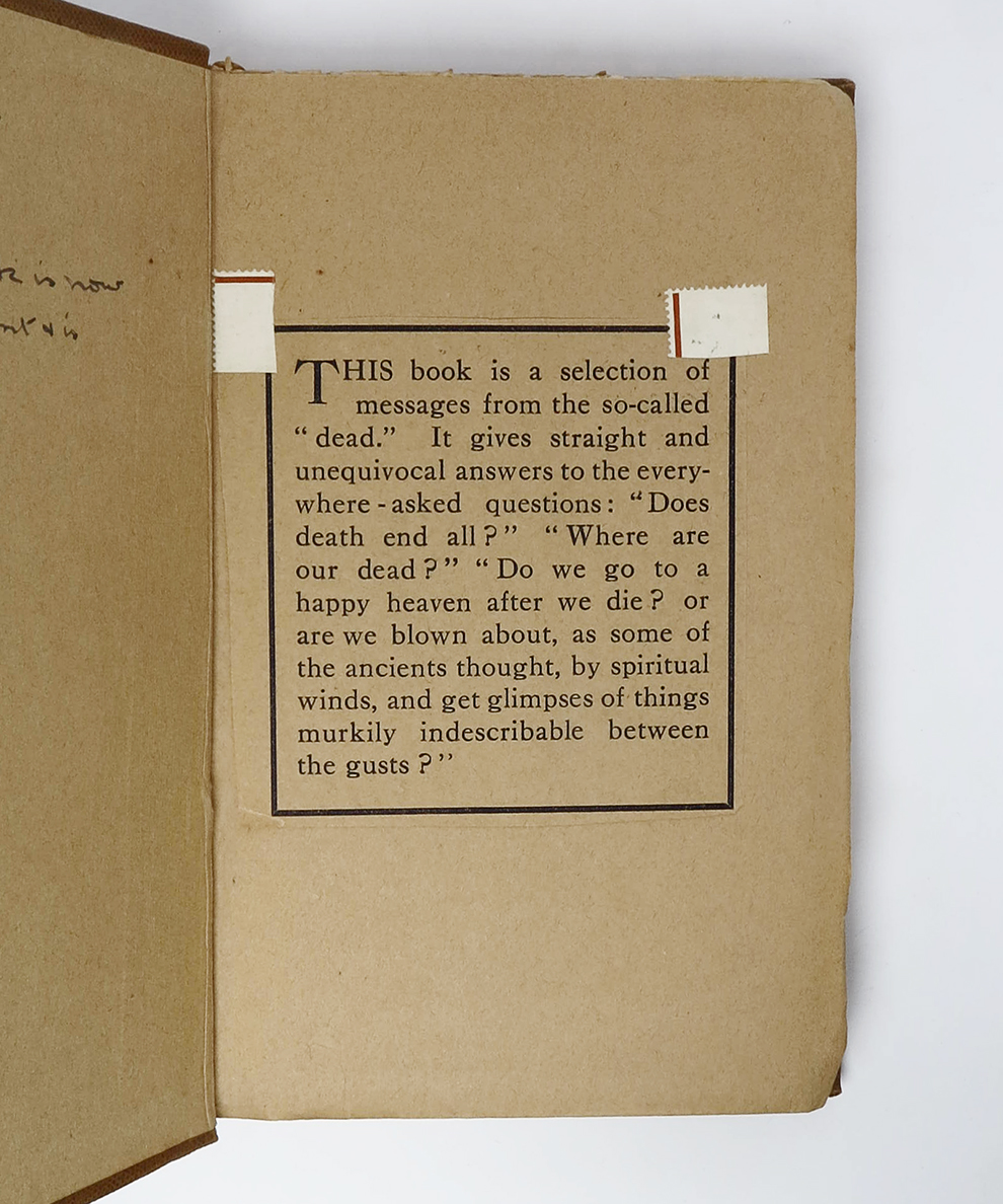 An anthology of psychographic works edited by the occultist Harold Bayley (1869-1965). With a two-page introduction by Conan Doyle, in which the author describes Spiritualism as ‘a new wave rolling in from the dim immensity of the beyond, carrying cleansing and freshness to the somewhat stagnant pools into which our present religious systems have settled.’