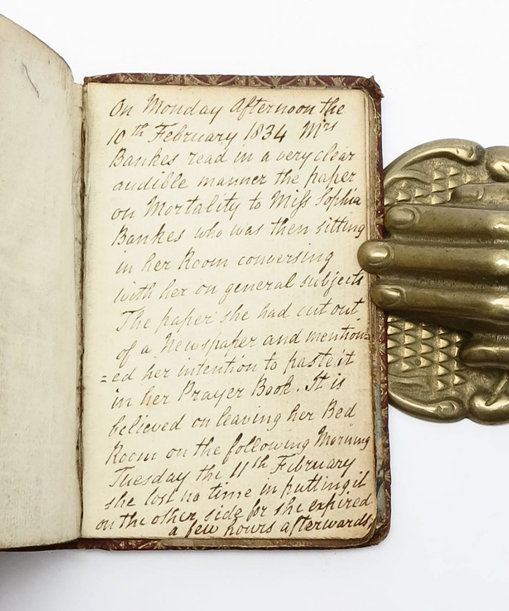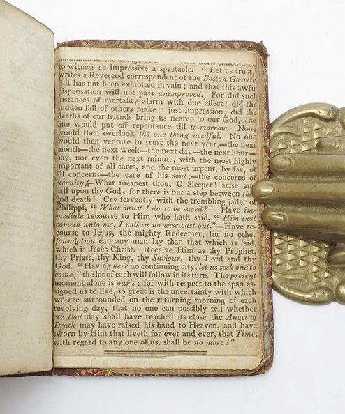 Boston Gazette. On the next leaf is a short manuscript account from the nineteenth-century recalling a Mrs Banks (likely the Mrs Banks née Truman whose initials are tooled to the binding), on her deathbed, reading the passage aloud to a Miss Sophie Banks before declaring that she would paste it in her prayer book. The manuscript authors supposes that Mrs Banks must have ‘lost no time’ in doing so, as she died the morning after, on 11 February 1834. The last record of what may have been its owners dying act, which intimately shows a passage of sermonising being taken from print, to an oral discussion between two women, to its final resting place, pasted to the end of this volume.