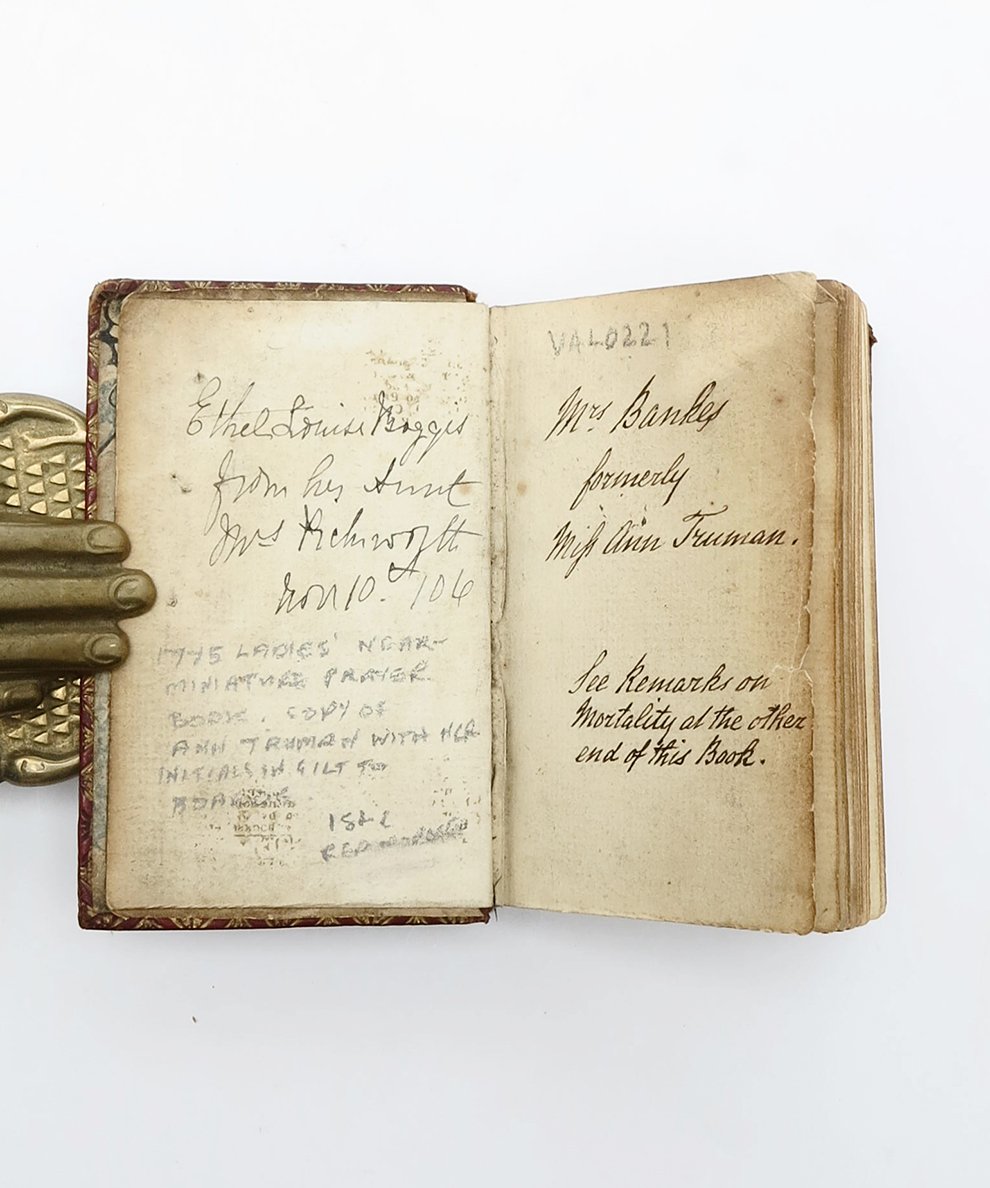 An almost miniature authorised Book of Common Prayer which records a remarkable encounter between two women. Pasted to one of the final end-papers is a short extract from a newspaper on mortality, taken from a sermon recorded in the