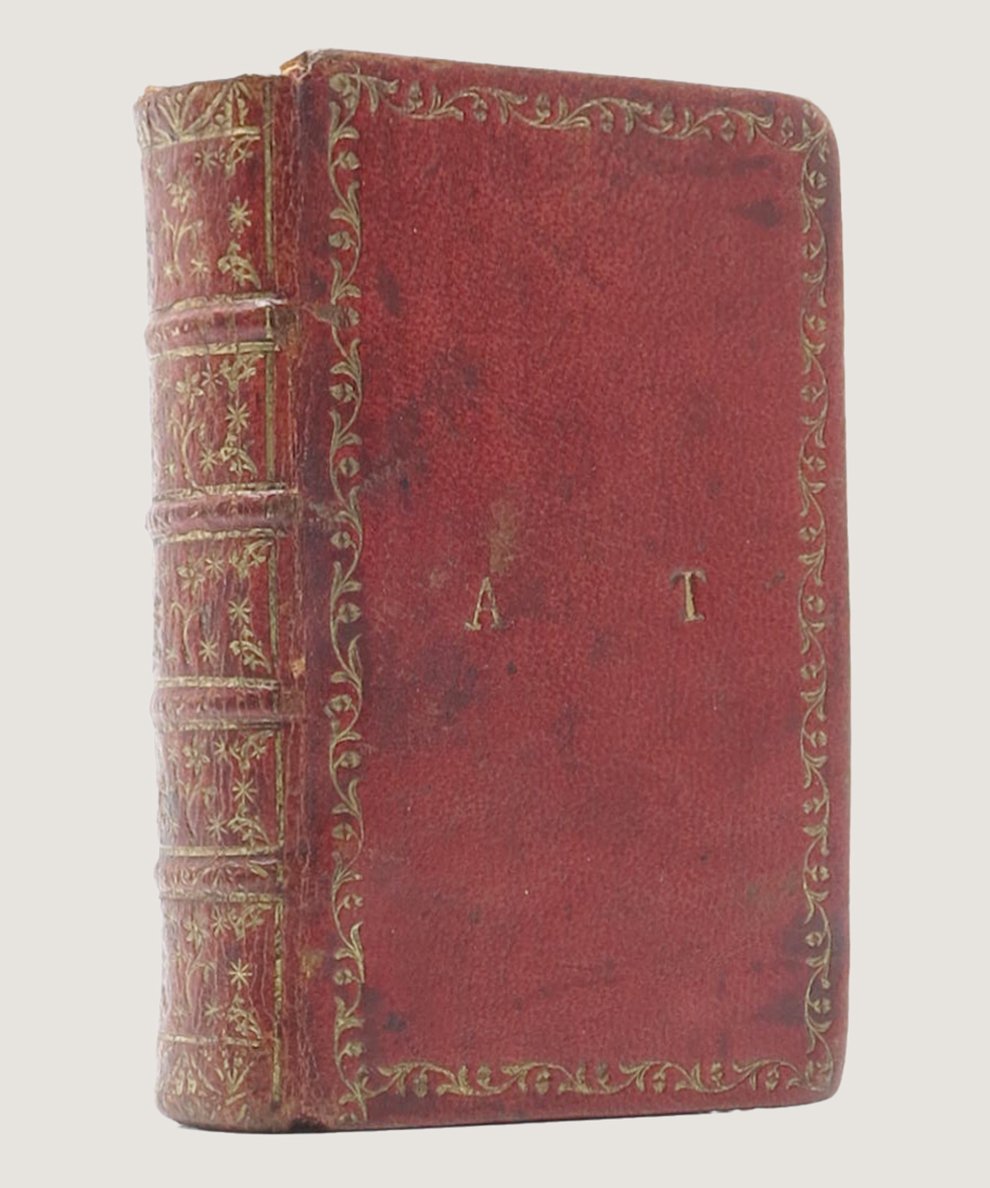 8. Crimson full morocco; spine on five raised bands, elaborate floral tooling to spine within compartments; ‘A T’ [i.e. Ann Truman] in gilt within border of floral rolls to boards; gilt rolls to turn-ins and to edges of boards; all edges gilt; marbled end-papers. Ownership inscription ‘Mrs Banks formerly Miss Ann Truman See Remarks on Mortality at the other end of this Book’ to front free end-paper; ‘Ethel Louise Maggs from my Aunt Mrs Rehnworth[?] Nov 10th 104’ to facing end-paper; printed extract on mortality pasted to end, accompanied by leaf of manuscript commentary recalling a conversation between a Sophie Banks and Mrs Banks in 1834, who discussed the extract ‘in a very clear audible manner’, and then pasted it into this book before ‘expiring a few hours afterwards’. Loss to head of spine, corners bumped, small areas of rubbing to boards. Contents clean a bright. A very good copy.