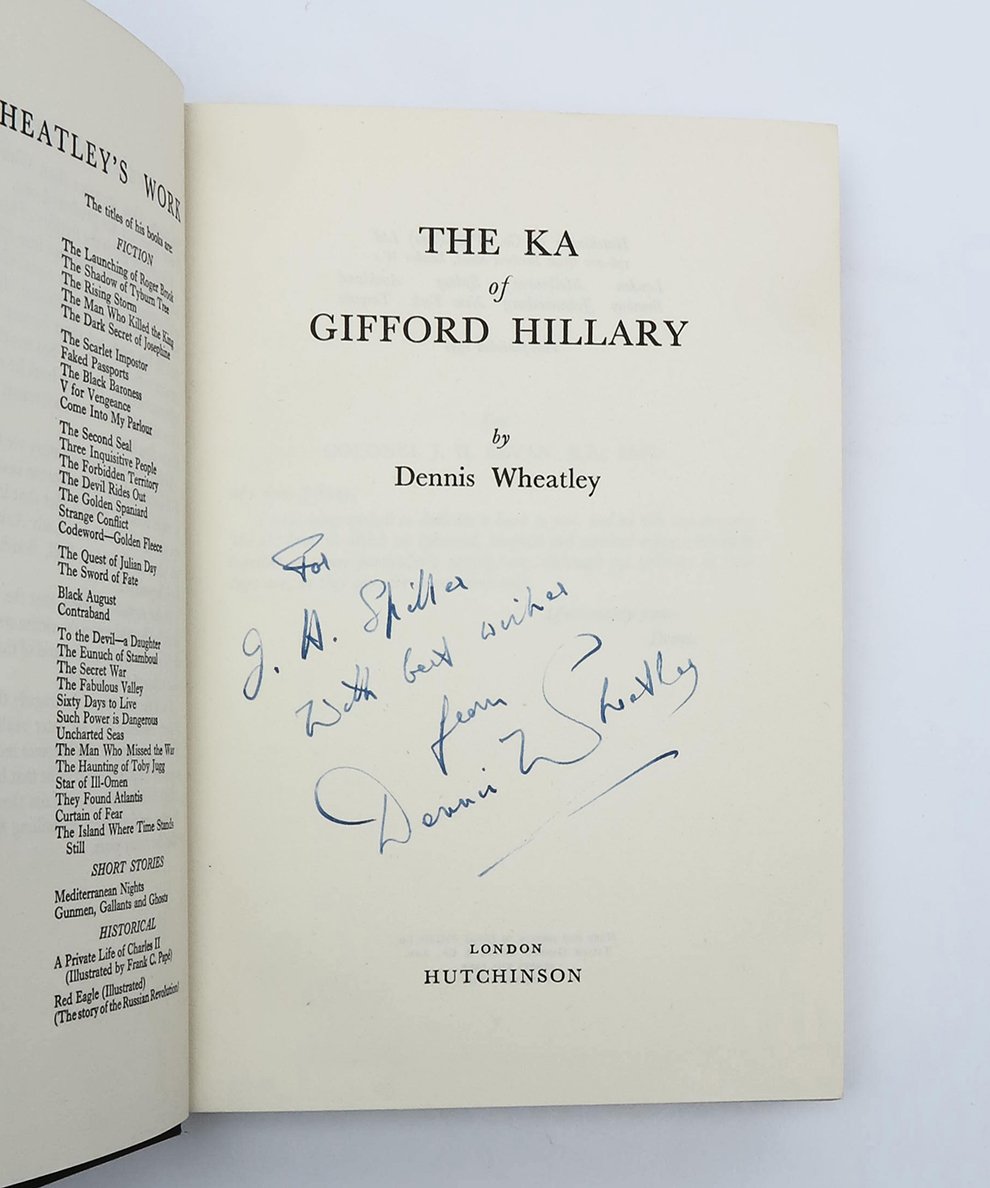 First edition, first printing. Octavo, pp., 407, [1]. Publisher’s original black cloth, titled in gilt to spine, in the original pictorial dust jacket illustrated by Sax. Inscribed by the author to title page ‘For // G. W. Shiller // With best wishes // from // Dennis Wheatley’. Jacket price-clipped, loss to head of spine, and closed tear to lower panel, some creasing to edges. Binding square and solid, some tarnishing to gilt. Contents clean and bright. A very good copy in like jacket.